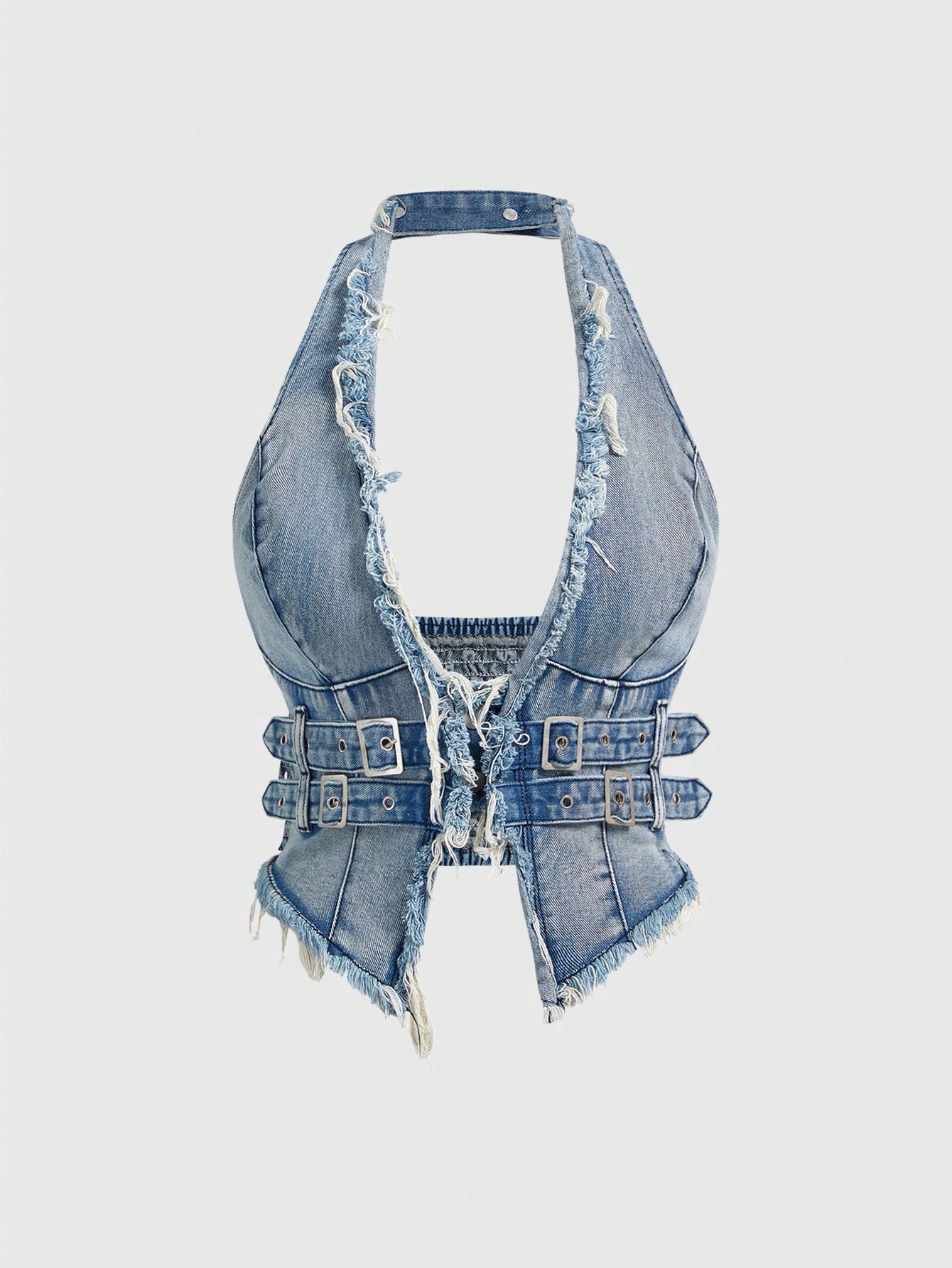 Hippie Blusa de mezclilla sin mangas con escote en V profundo, dobladillo con flecos y diseño de hebilla en la cintura para mujer