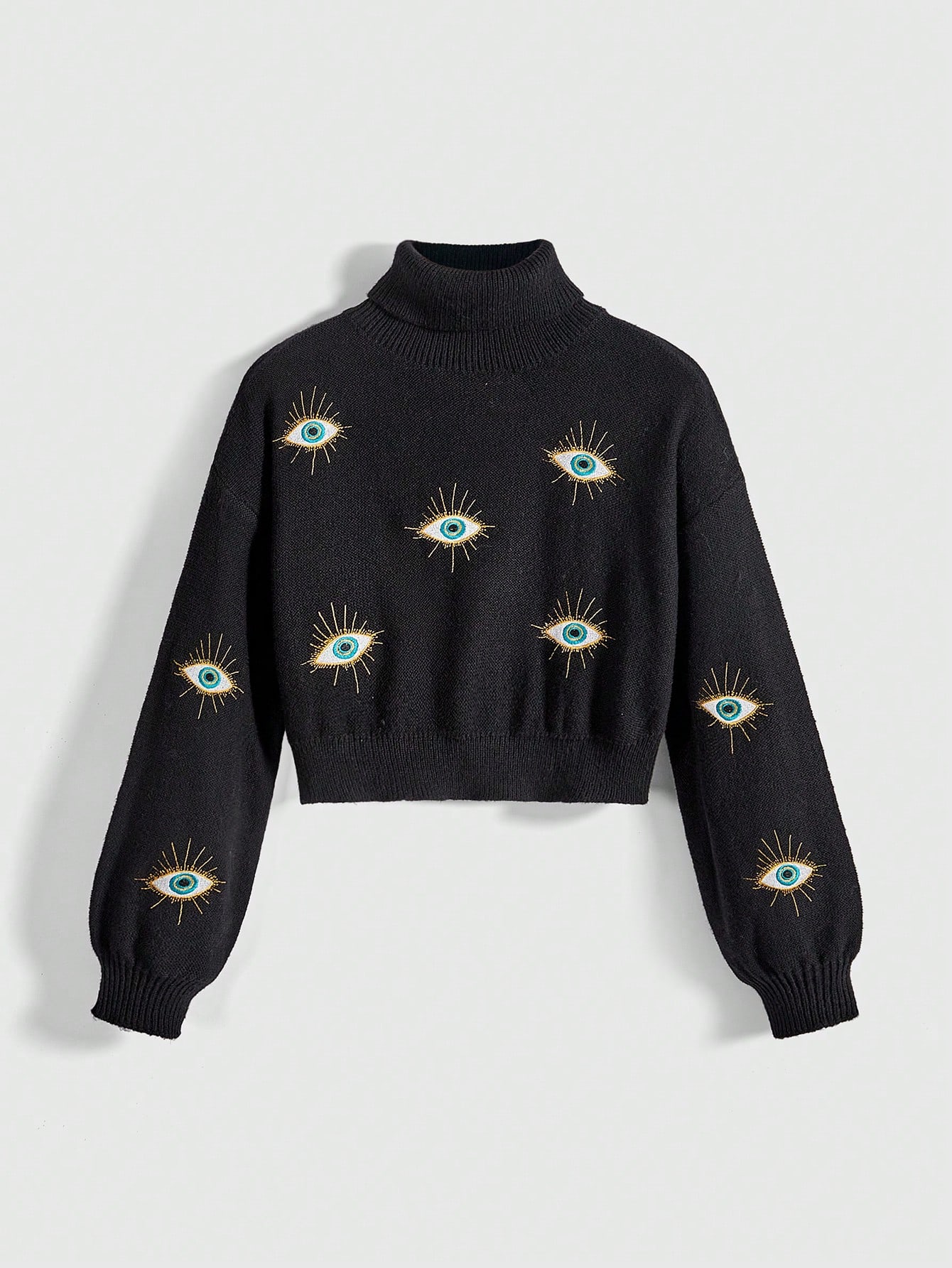 Suéter de punto con cuello alto, bordado y gráfico de ojo, estilo vintage hippie para mujer