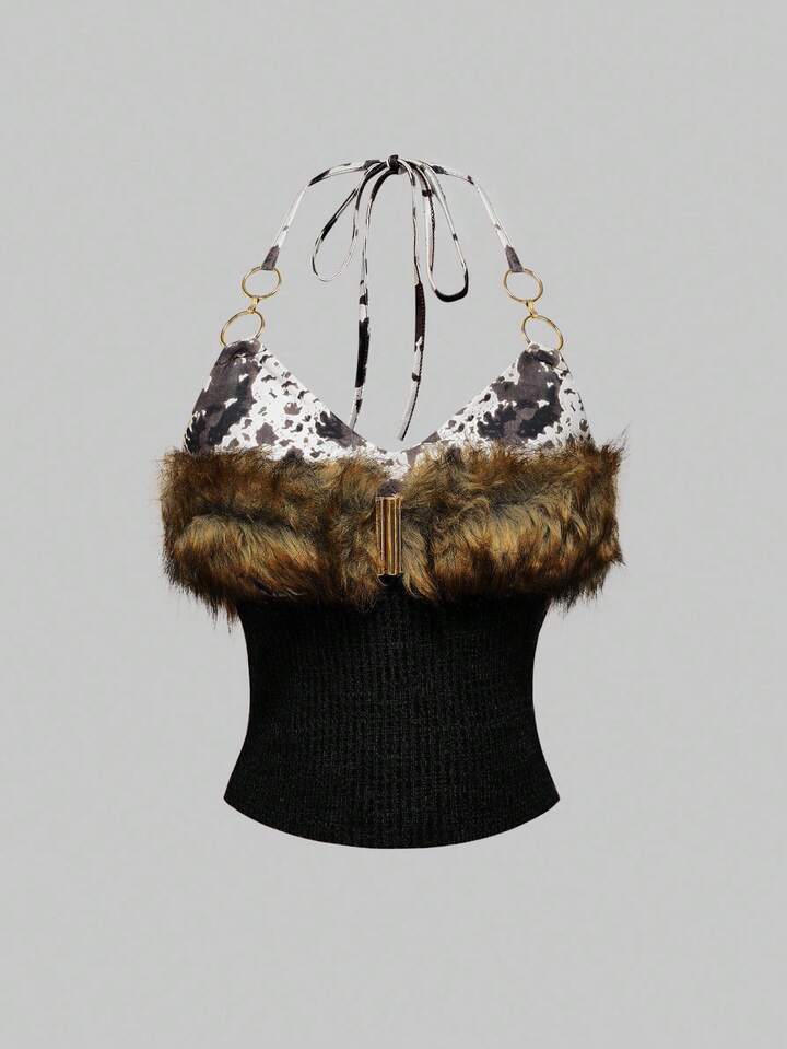 Hippie Top corto sexy de mujer estilo Y2K, top halter con parches de piel sintética y estampado de leopardo