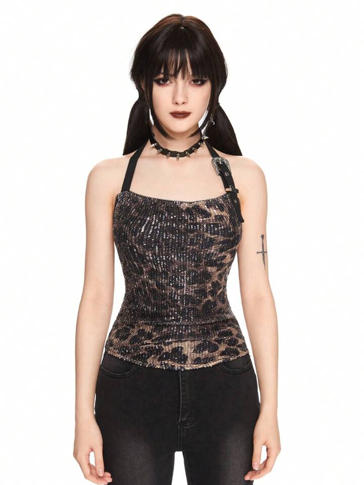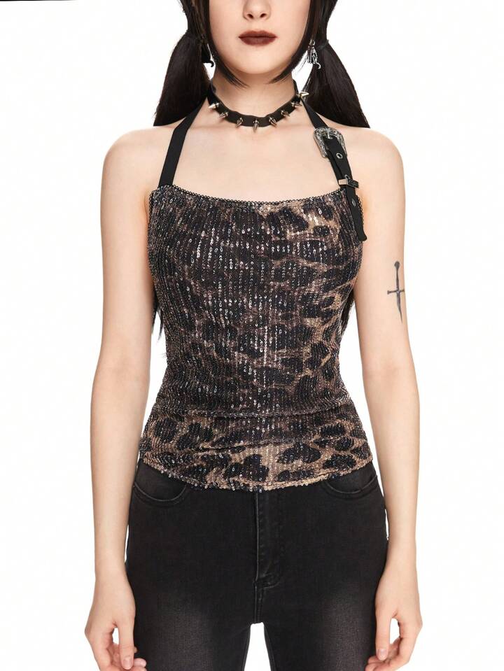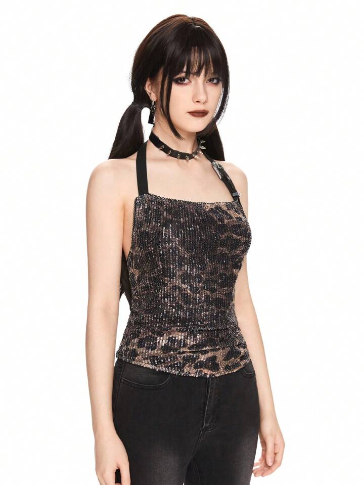 Hippie Top sin mangas de estilo urbano para mujer, elaborado con tela de lentejuelas con estampado de leopardo, inspirado en el estilo Y2K