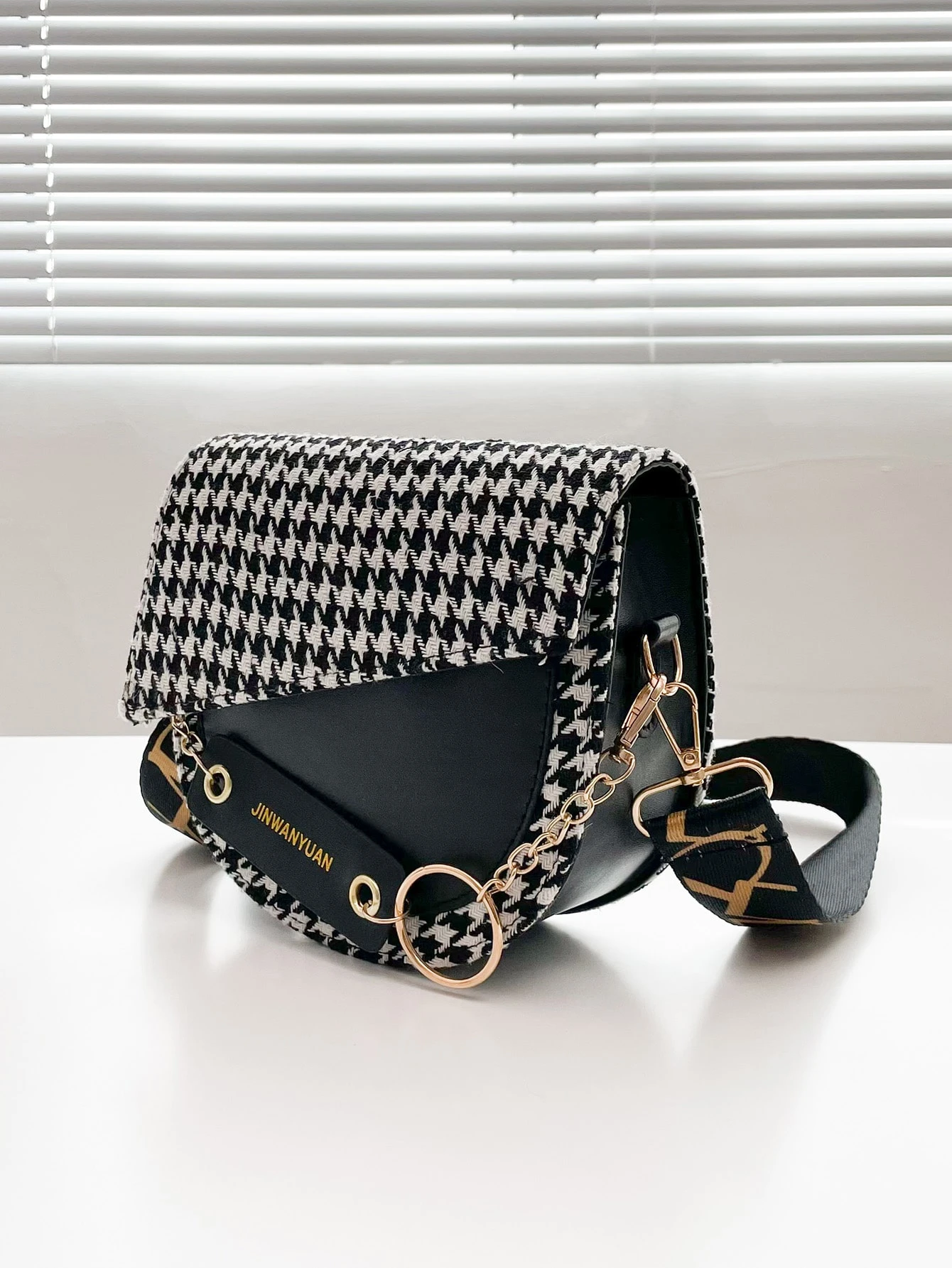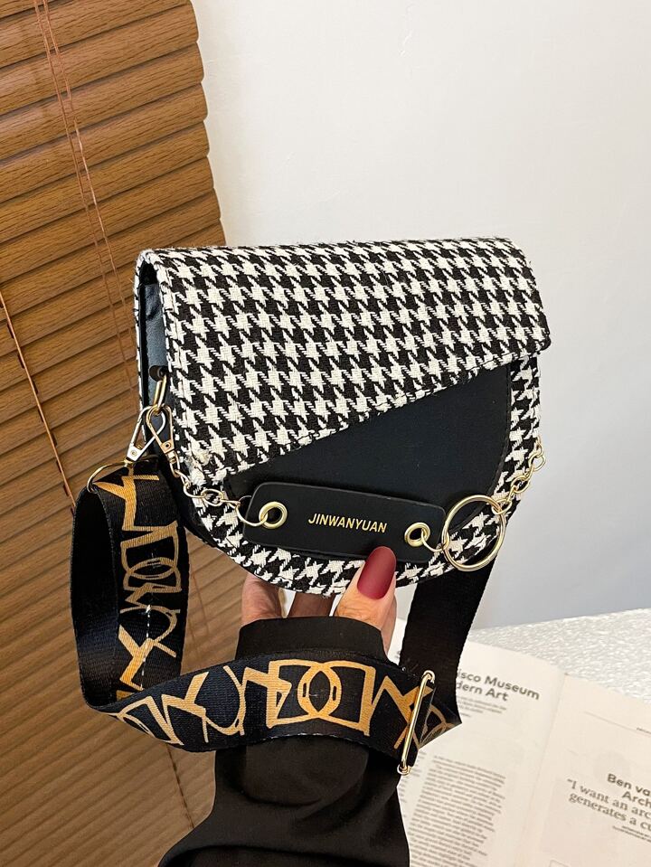 Bolso sillín con solapa con estampado de pata de gallo y letra