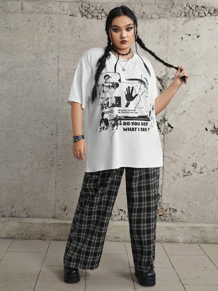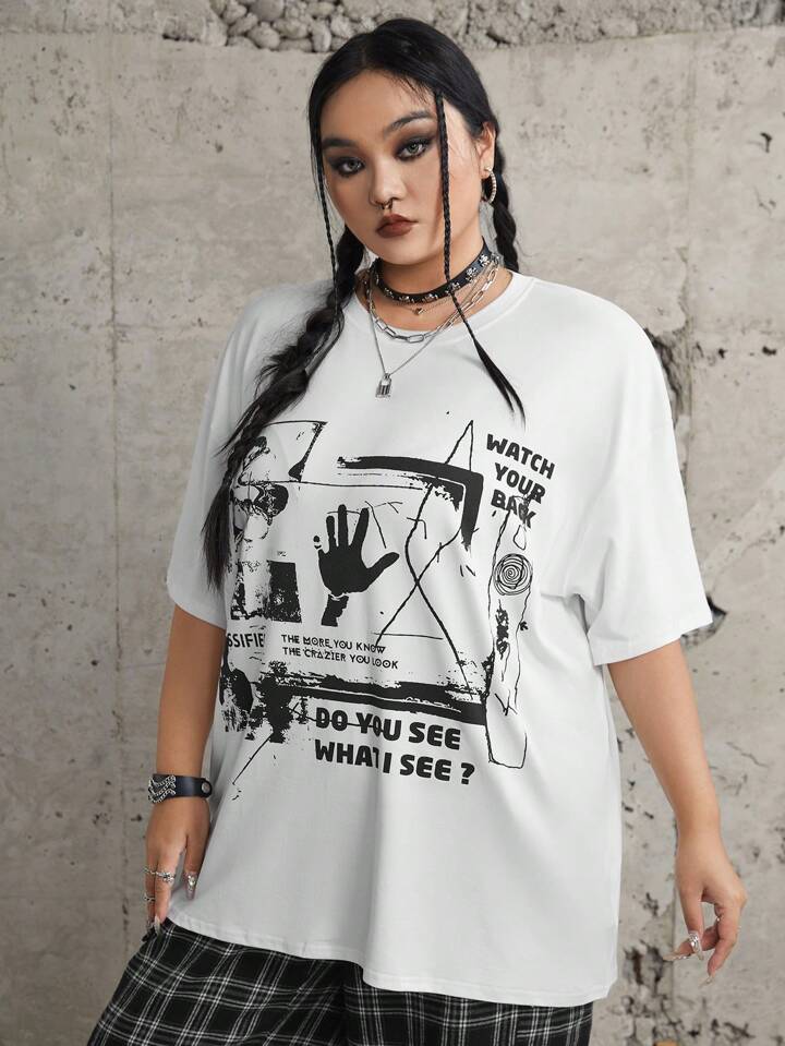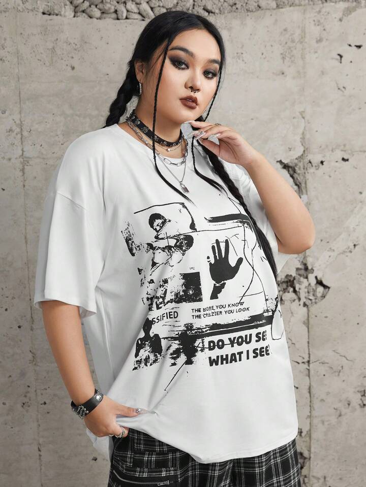 Hunows Talla grande Camiseta de hombros caídos con estampado de figura y slogan