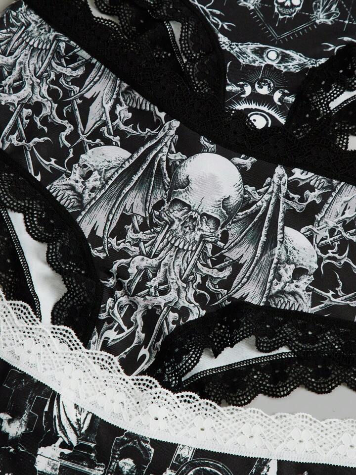 IamYouth Goth 3 piezas Set bragas estampado de cráneo con encaje en contraste