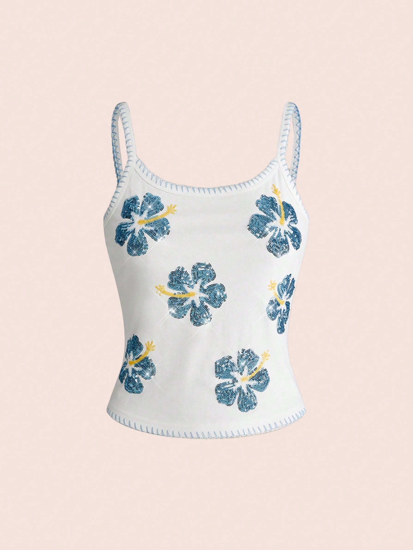 Top ajustado de mujer con bordado de lentejuelas de hibisco brillante estilo "Island Babe"
