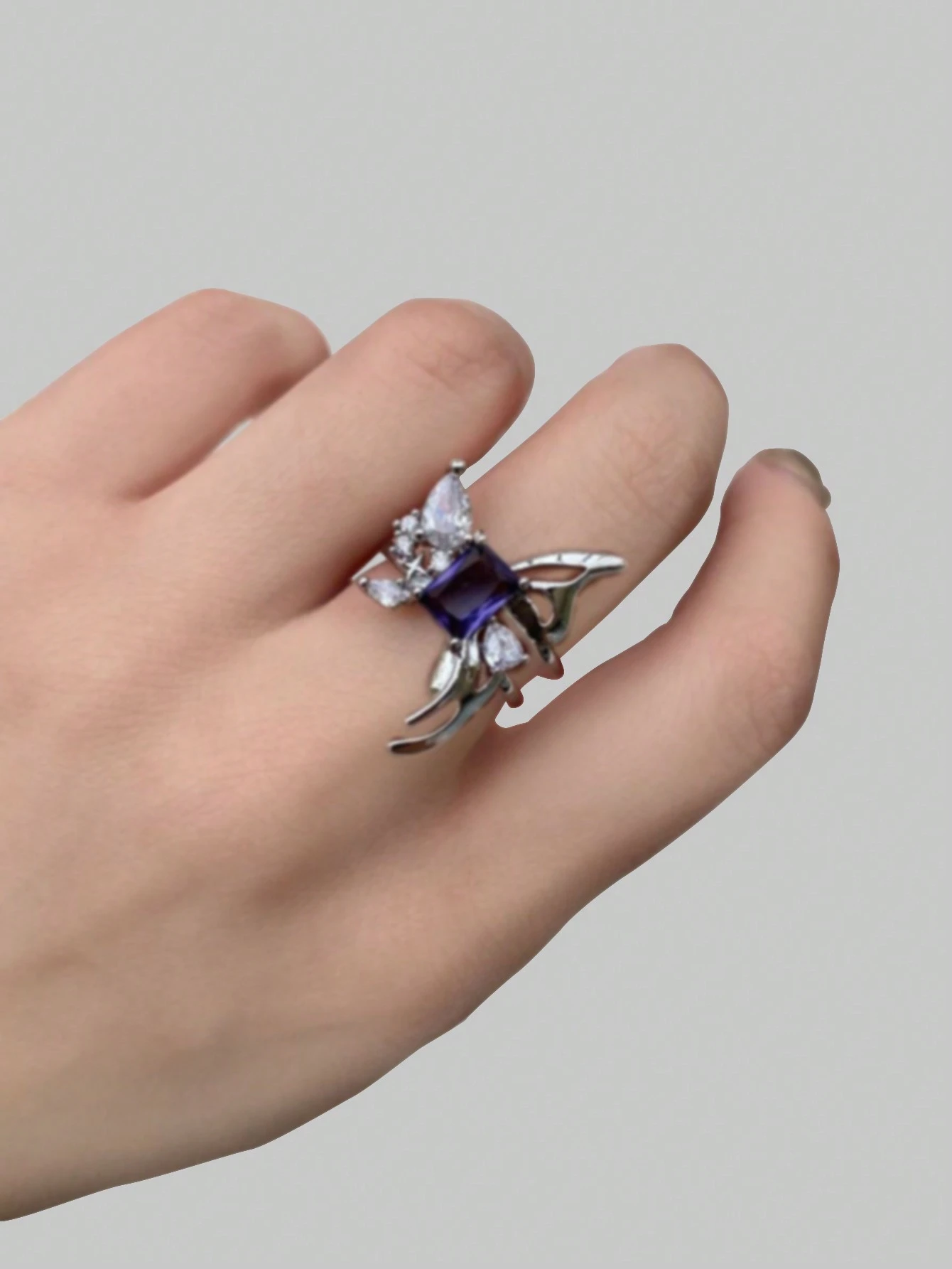 J-Fashion 1 pieza Anillo único con diseño de mariposa hueca con circonita morada para mujer