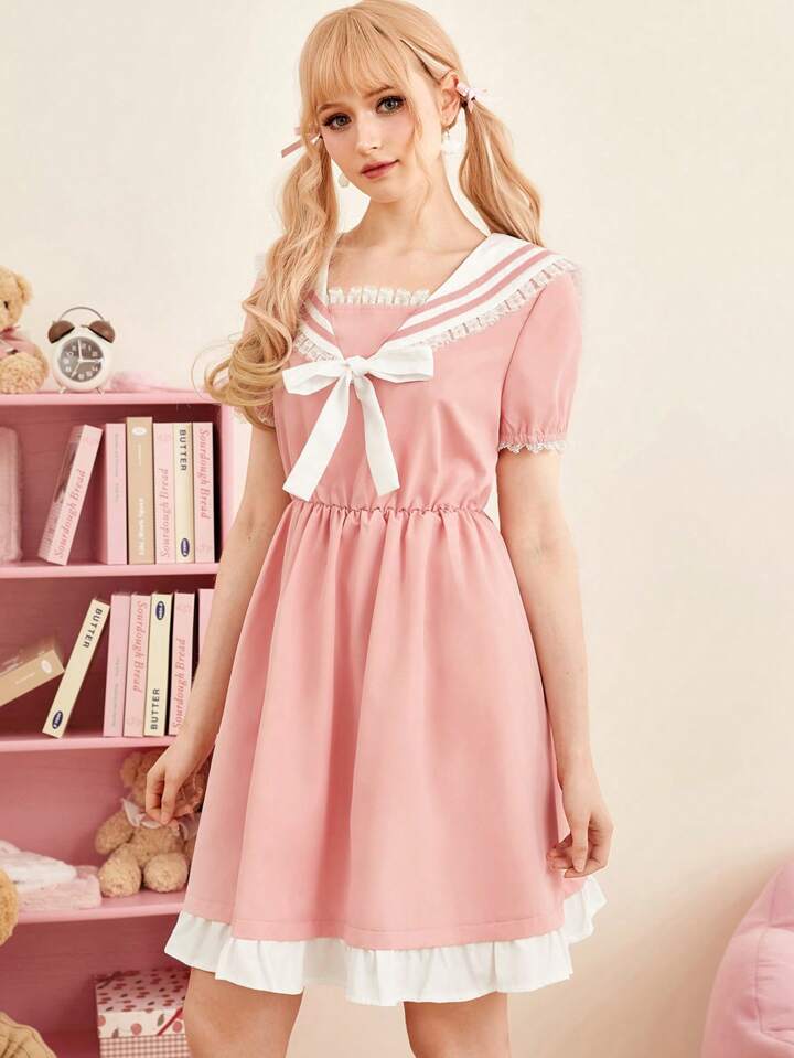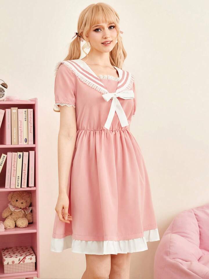 J-Fashion Vestido con lazo delantero cuello marinero bajo con fruncido