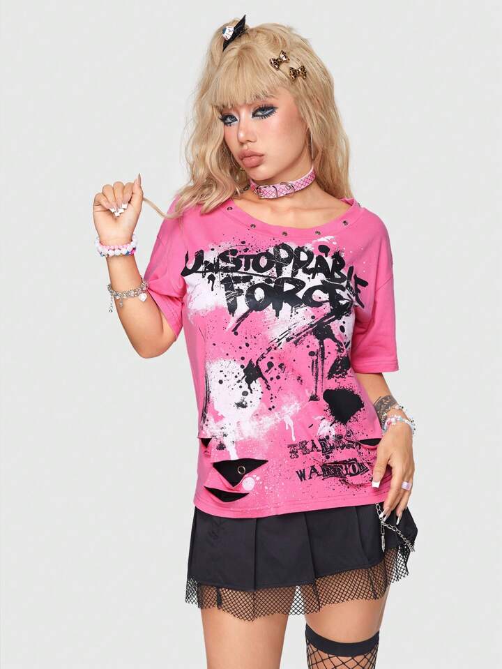 J-Fashion Camiseta Rasgada Impresa Con Salpicaduras De Tinta