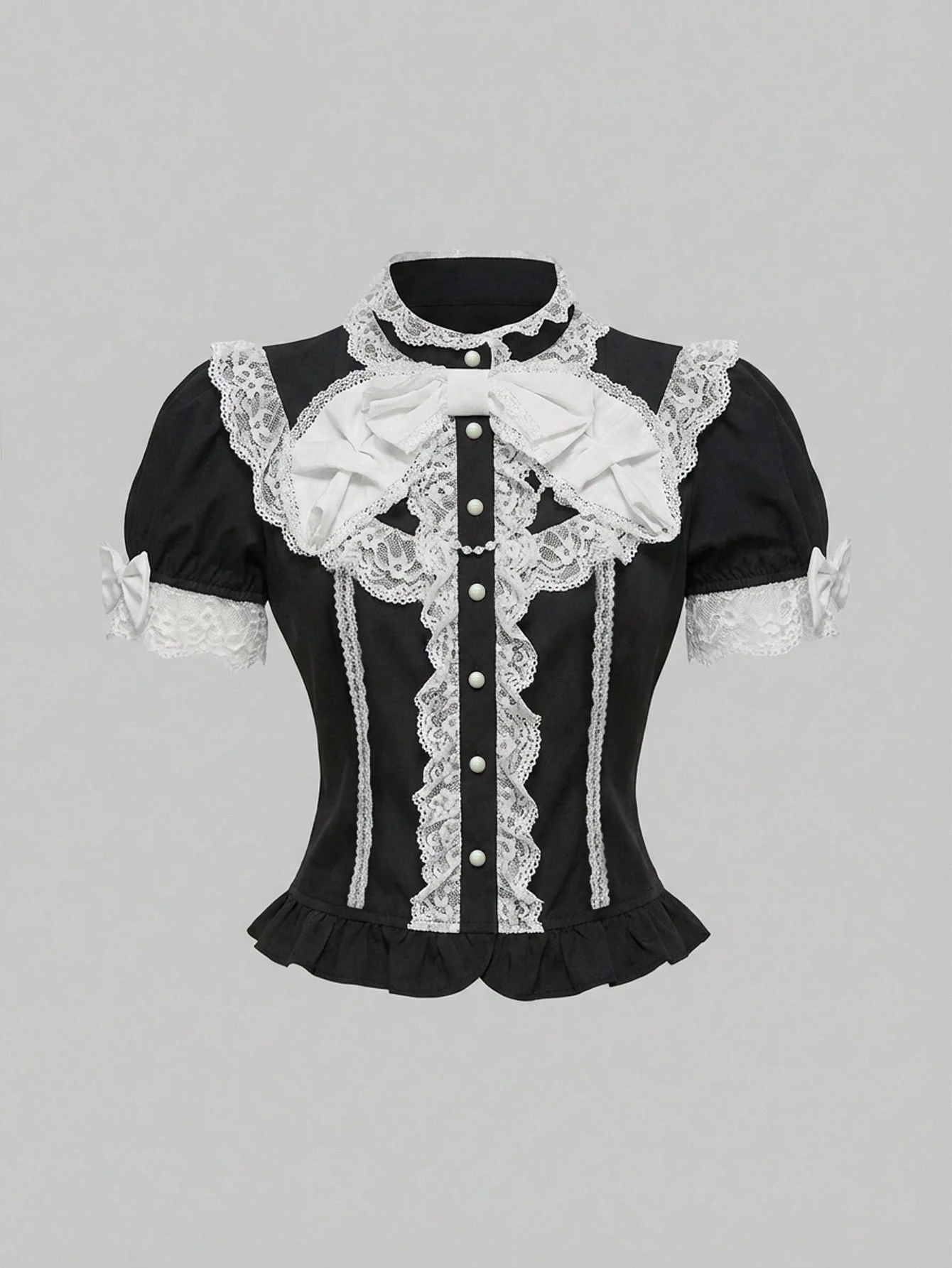 J-Fashion Blusa de mujer con decoración de lazo 3D, mangas abultadas, estilo Lolita, Kawaii y dulce para el verano