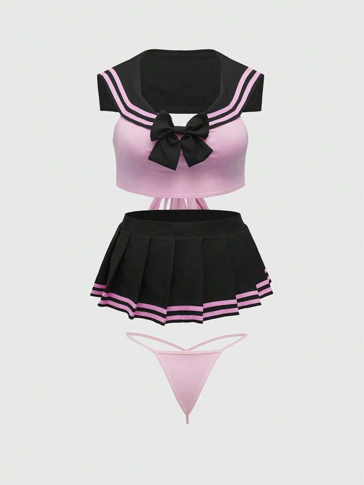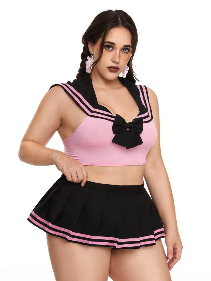 J-Fashion Conjunto de lencería con disfraz de uniforme de marinera sexy de talla grande con corbata de moño y falda plisada