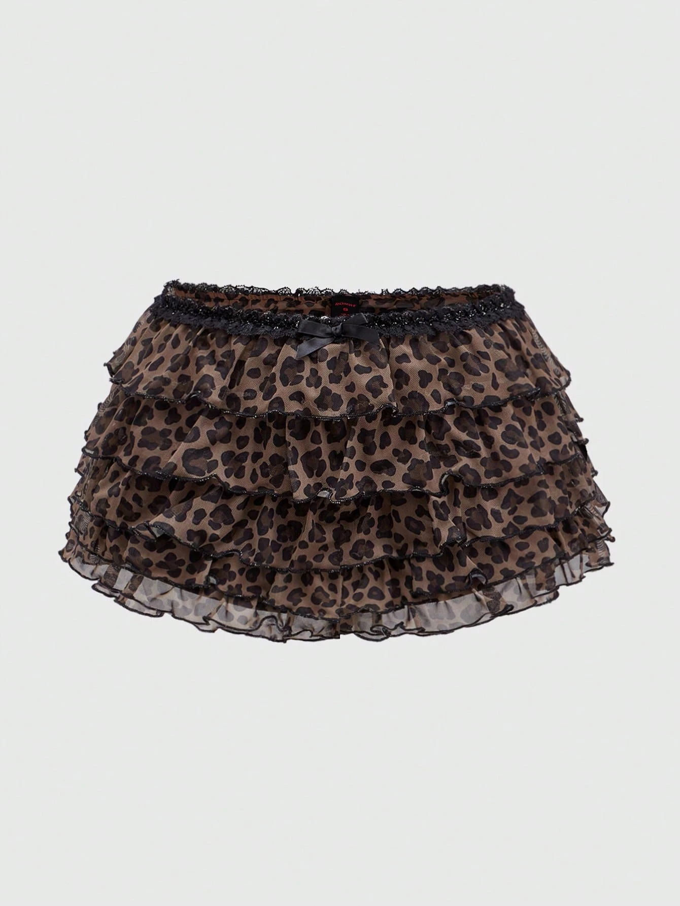 J-Fashion Shorts extra grandes de volantes con dobladillo a capas de malla con estampado de leopardo vintage