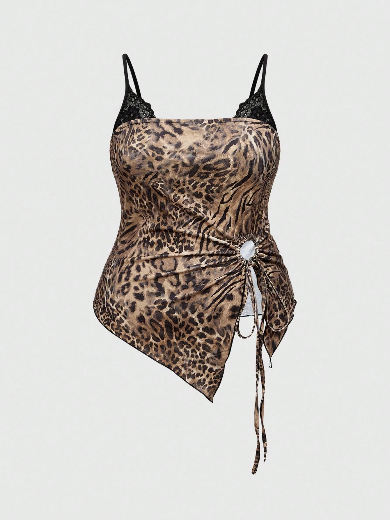 J-Fashion Camiseta de tirantes con estampado de leopardo, dobladillo asimétrico y ribete de encaje para mujer de talla grande