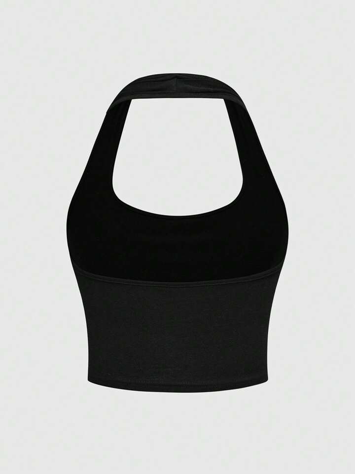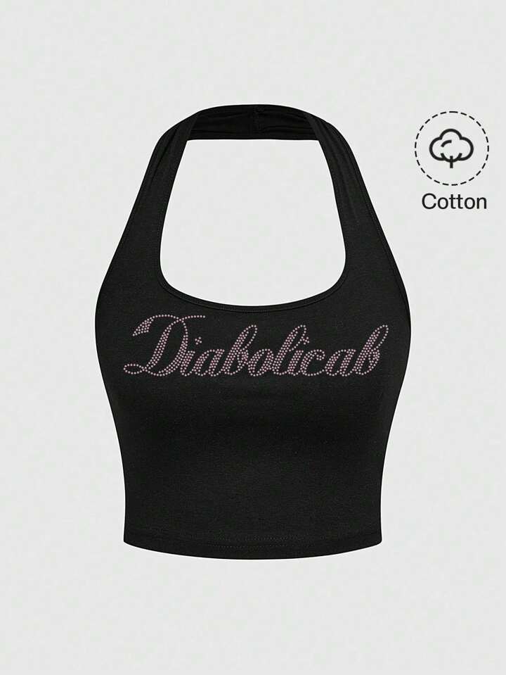 J-Fashion Top de tirantes con cuello de halter con eslogan de strass para mujeres