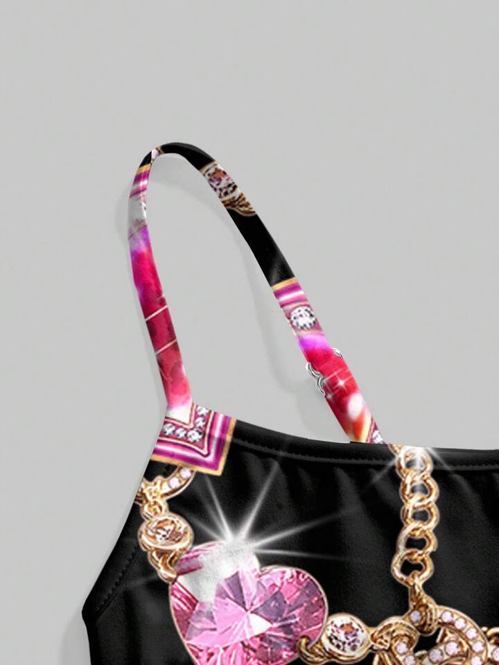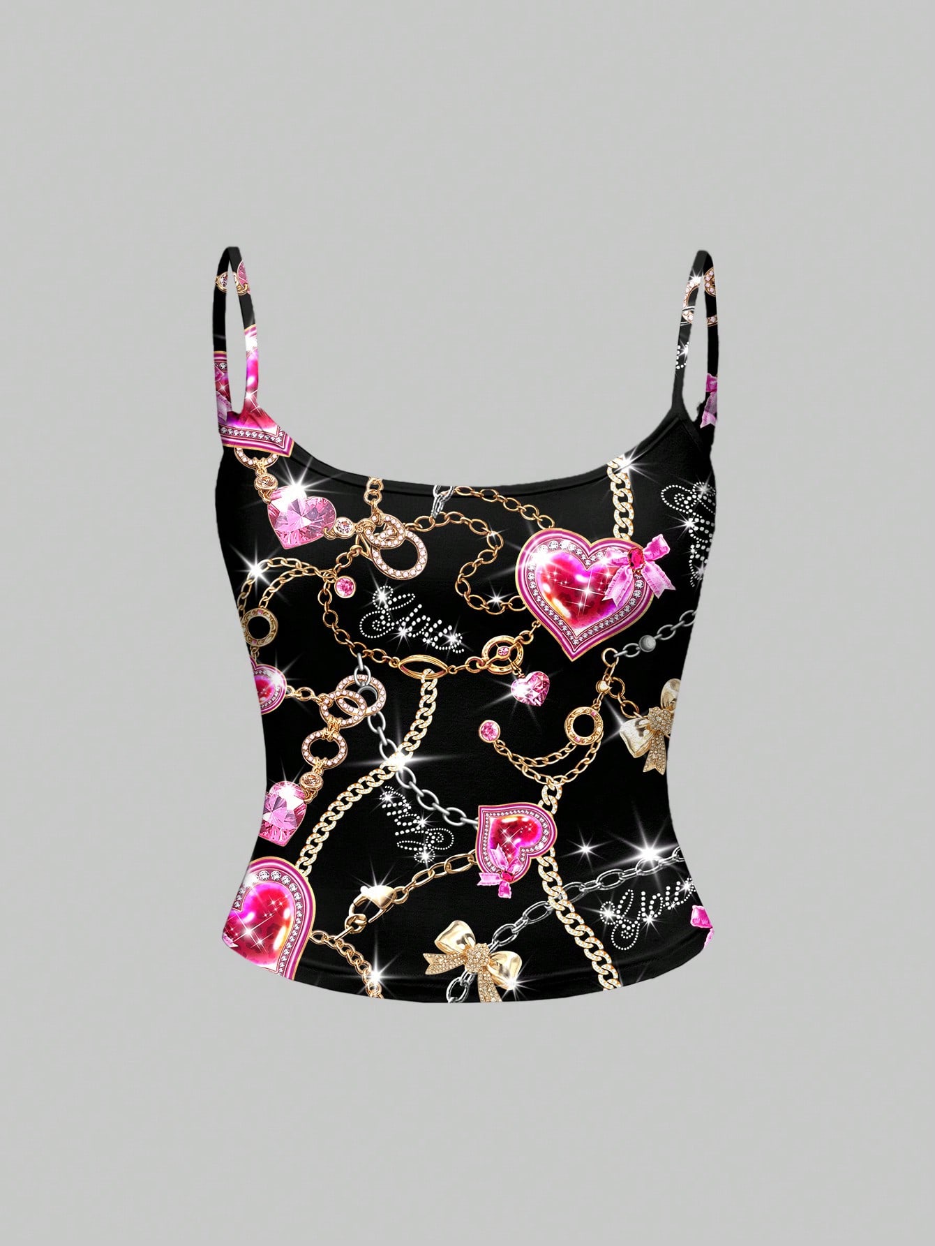 J-Fashion Top sin mangas sexy y lindo para el verano, con cadena, adornos de corazón y cristales, diseño con eslogan para mujer