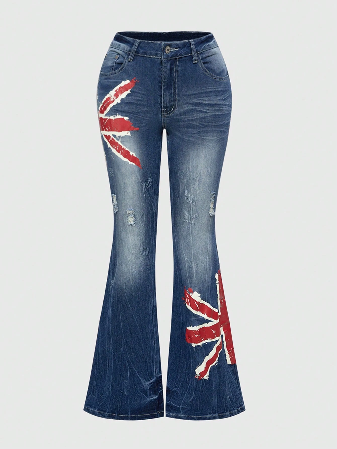 J-Fashion Vaqueros acampanados de cintura baja con estampado de bandera patriótica vintage Y2K
