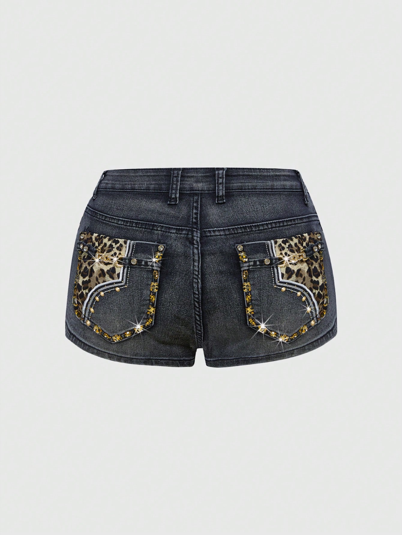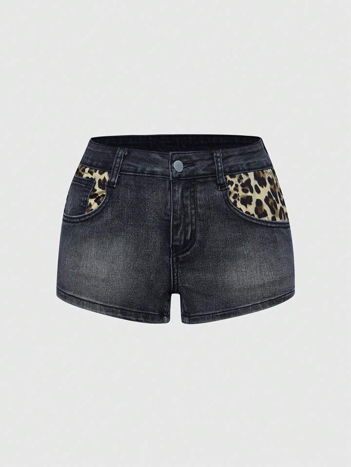 J-Fashion Shorts vaqueros casuales y versátiles con bolsillos y estampado de leopardo para mujer