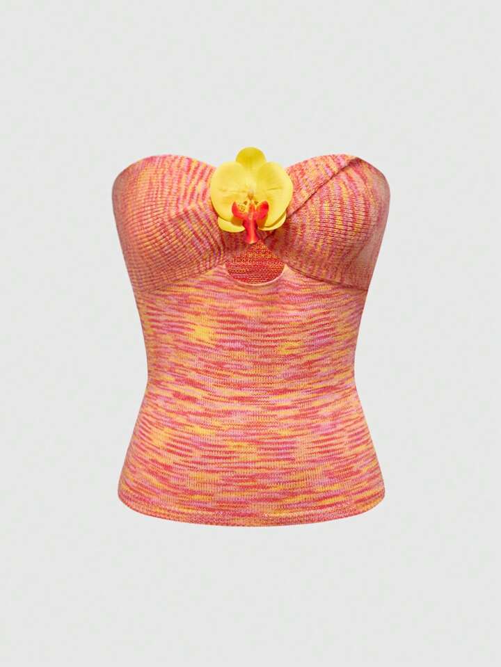 J-Fashion Top corto con escote estilo bustier con flores 3D, de tejido ceñido, estilo vacacional, para el verano