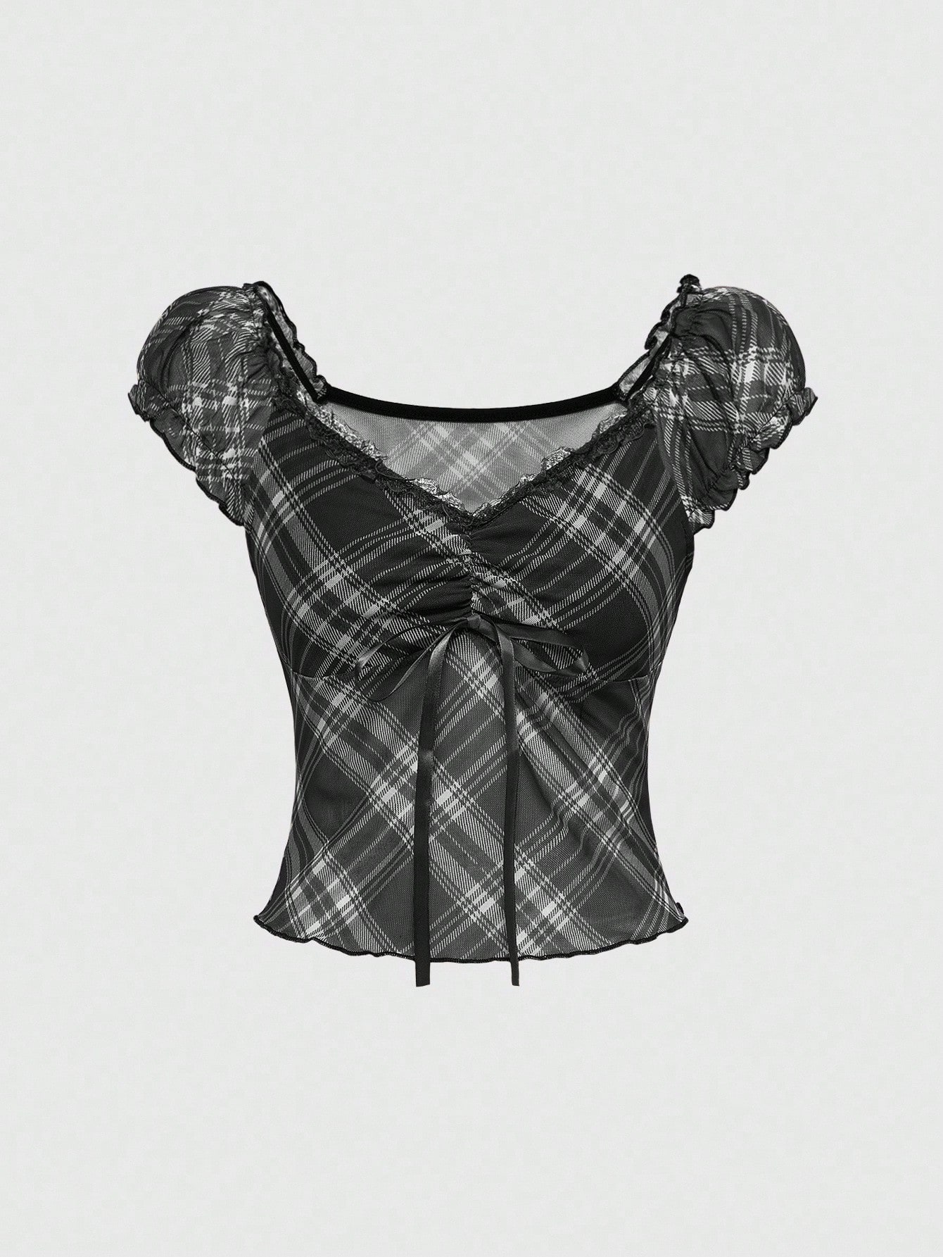 J-Fashion Camiseta informal de mujer con cuadros y detalle de encaje con lazo delantero, para verano