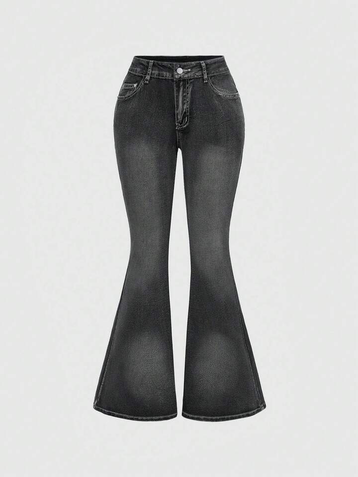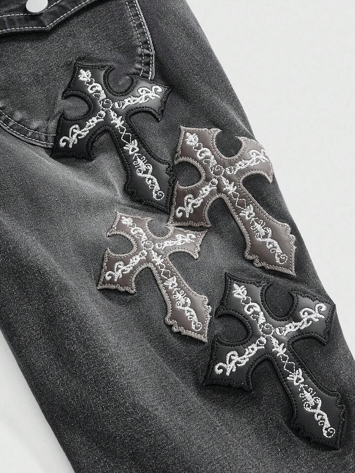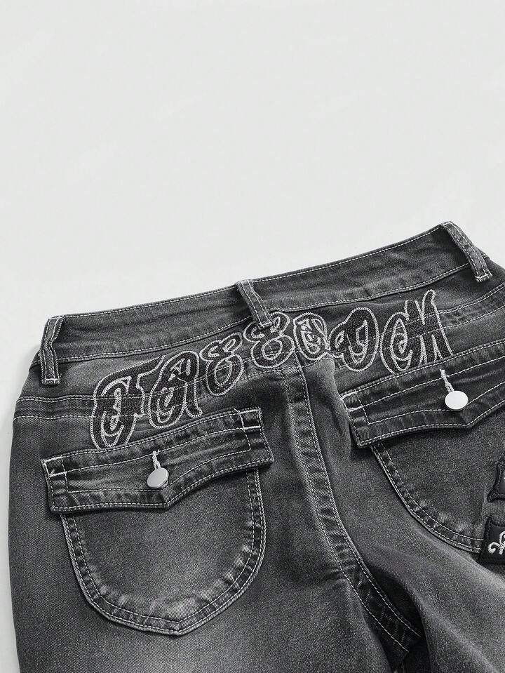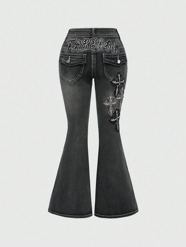J-Fashion Jeans acampanados de talle súper bajo con bordado de cruz y letra para mujer