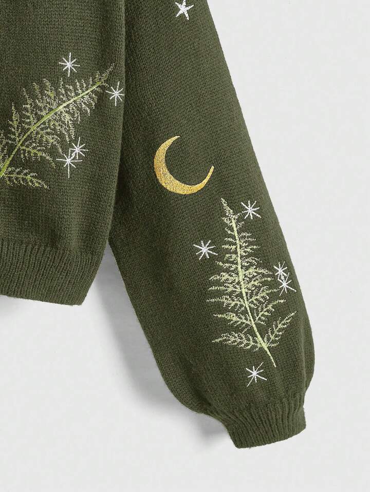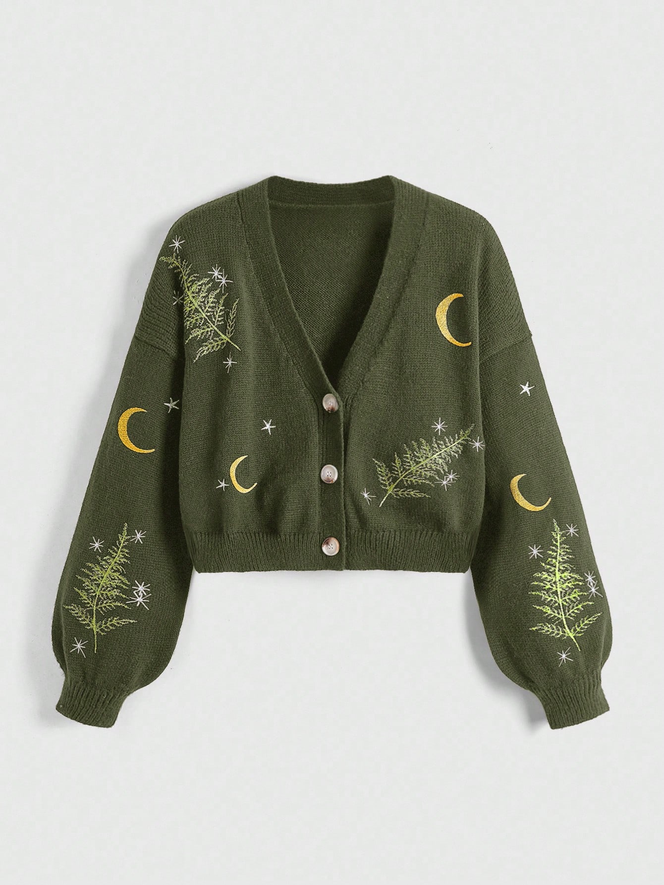 J-Fashion Cárdigan casual holgado de mujer con bordado de planta y luna, de abotonadura sencilla, de manga larga y hombros caídos