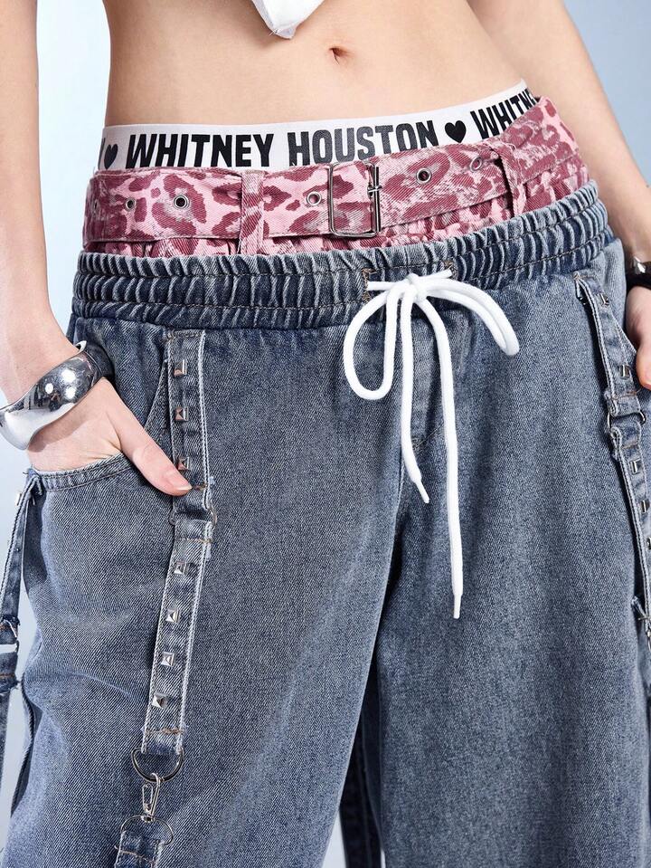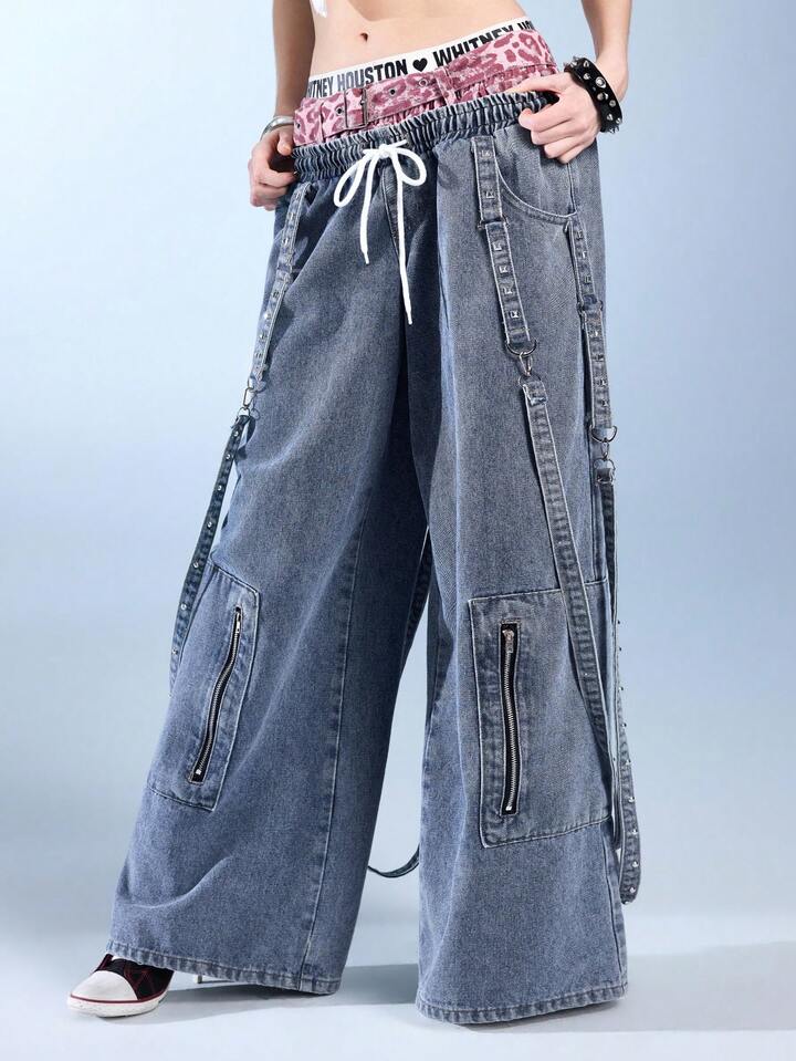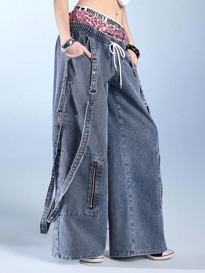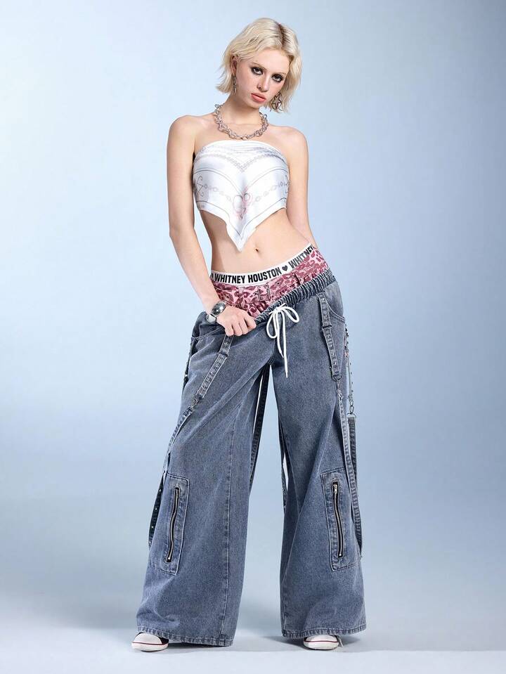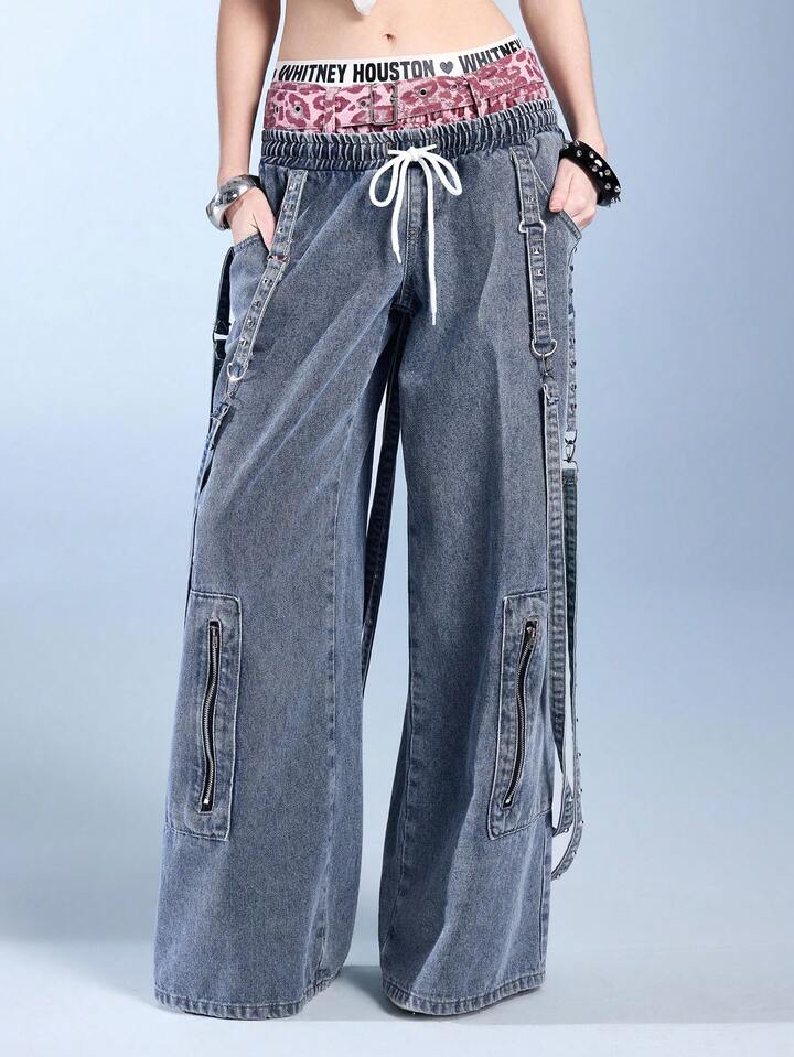 J-Fashion Jeans acampanados de carga con parches de colores contrastantes, cintura multicapa y logotipo "Y2K Babe" en estilo retro Y2K para mujer