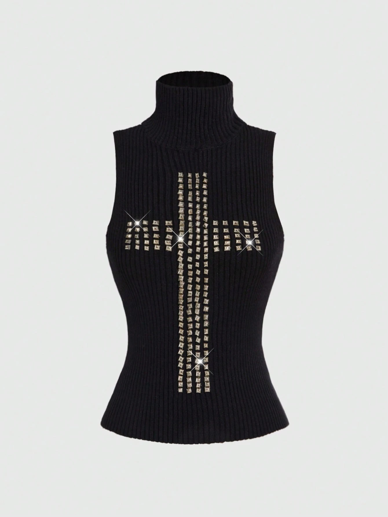 J-Fashion Blusa de punto con cuello alto, espalda descubierta, cruzada y con adornos de strass para mujer