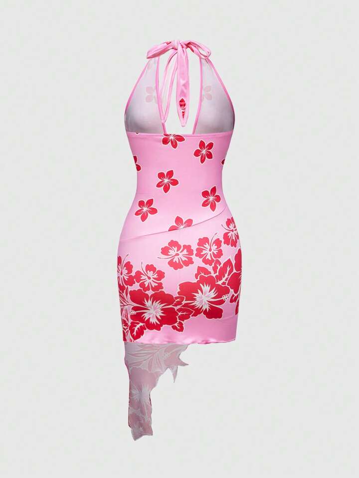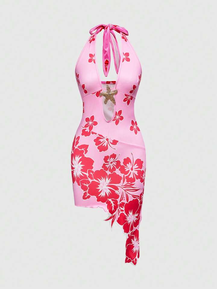 J-Fashion Vestido de mujer con estampado floral de verano, cuello en V profundo y bajo asimétrico