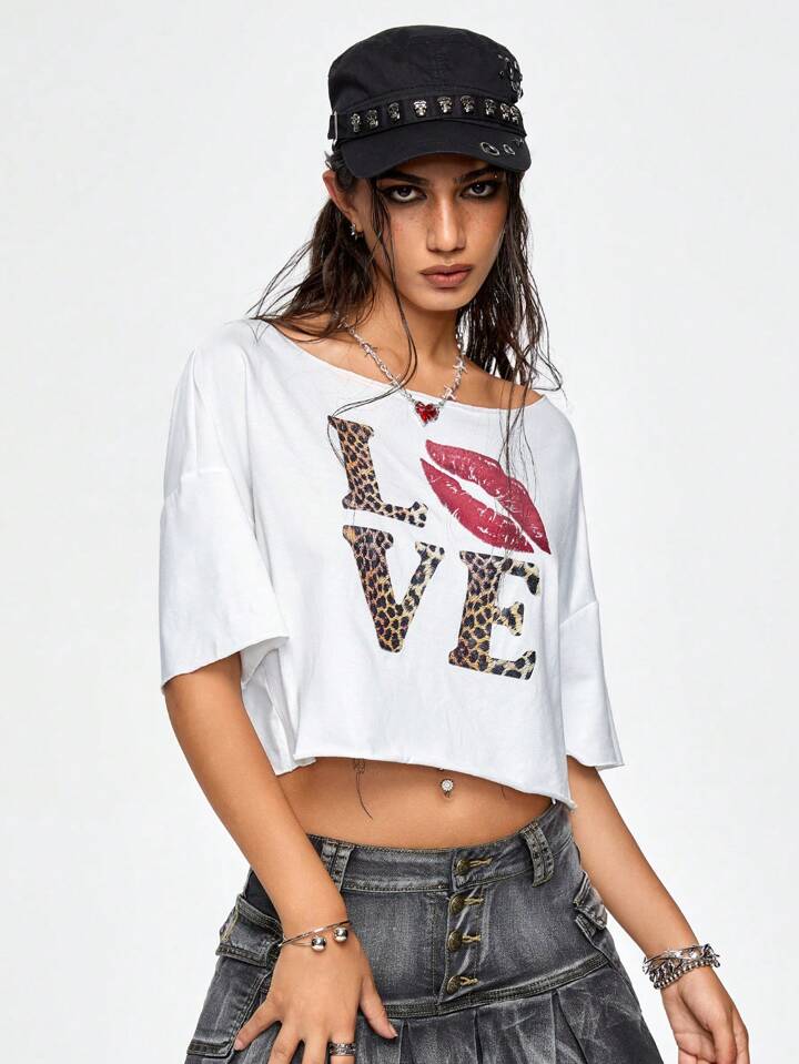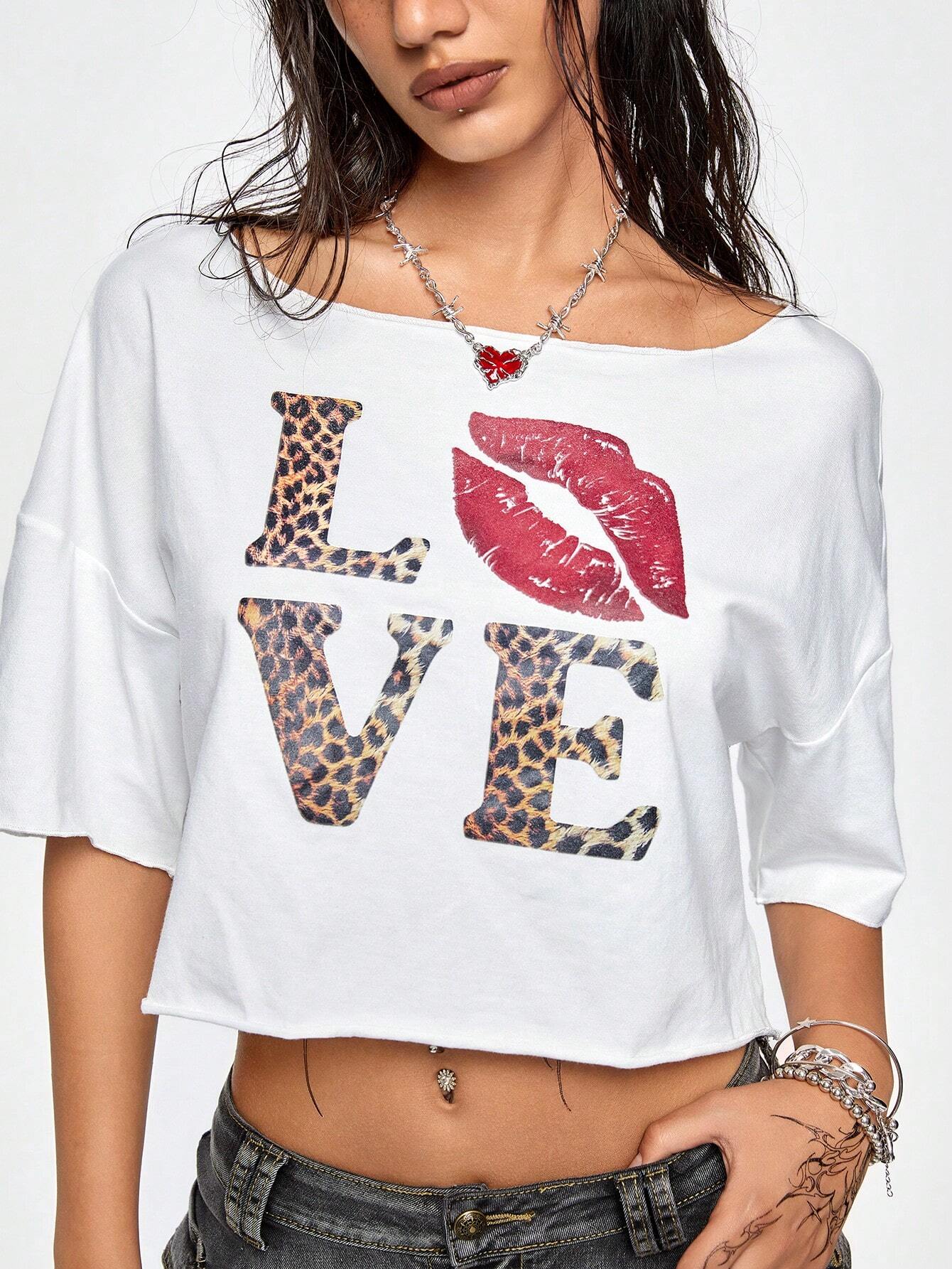 J-Fashion Camiseta extragrande con cuello asimétrico "AMO EL LEOPARDO" para mujer, Y2K