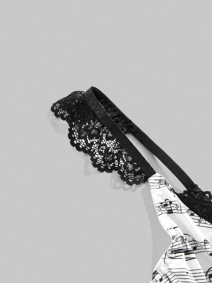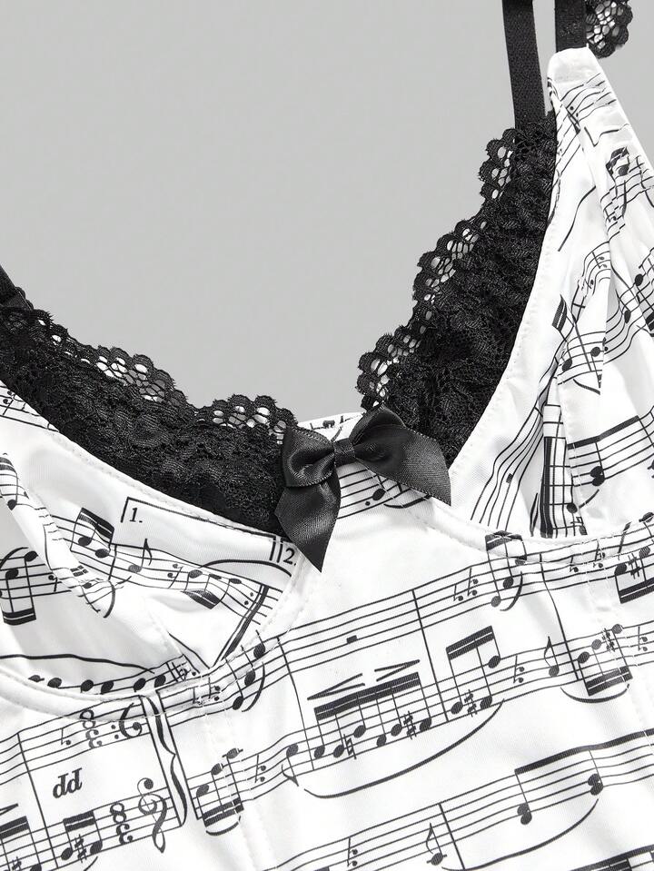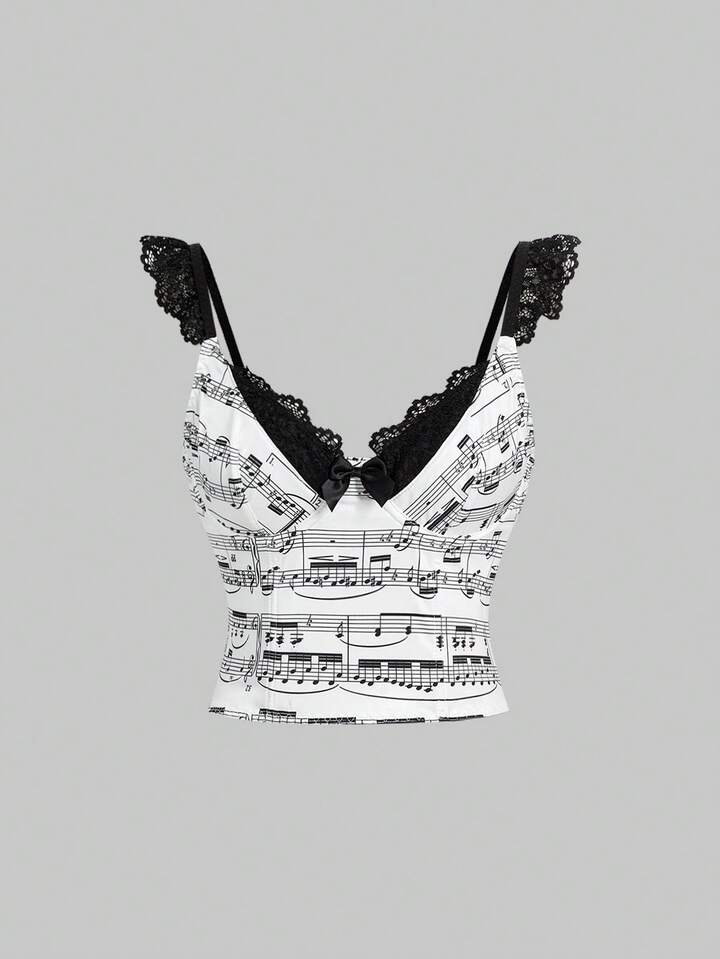 J-Fashion Crop top de mujer con estampado de notas musicales Y2K y ribete de encaje en contraste