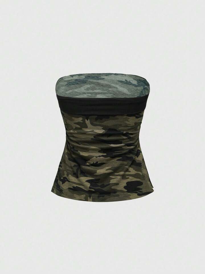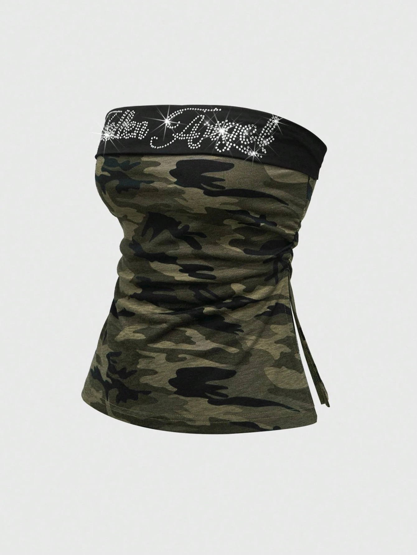 J-Fashion Top tubo con decoración de letras de cristal, efecto color block de camuflaje, estilo retro Y2K, sexy para mujer