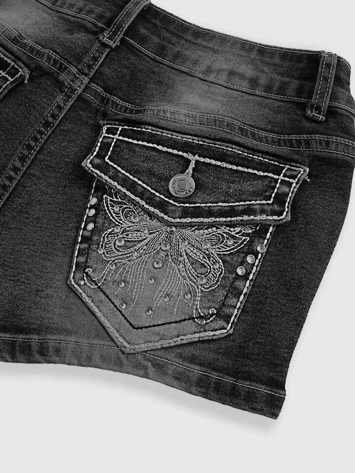 J-Fashion Shorts vaqueros súper cortos y de talle súper bajo con bordado de mariposa, tachuelas y efecto desgastado vintage para mujeres