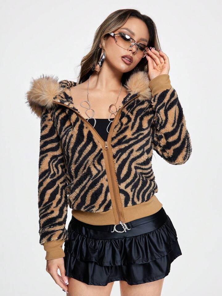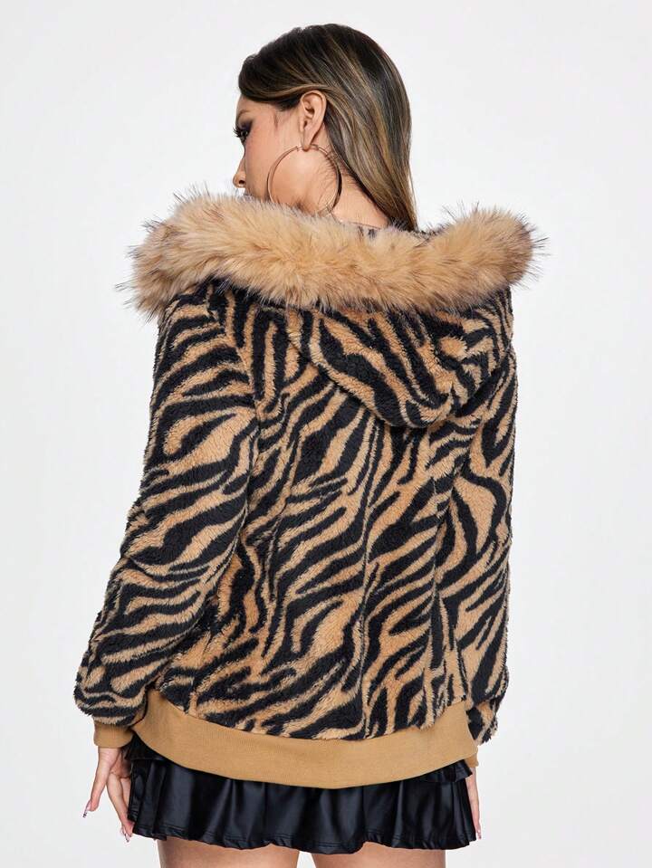 J-Fashion Chaqueta regular con capucha de estilo Gyaru Y2K Harajuku con estampado de cebra y pelo para mujer