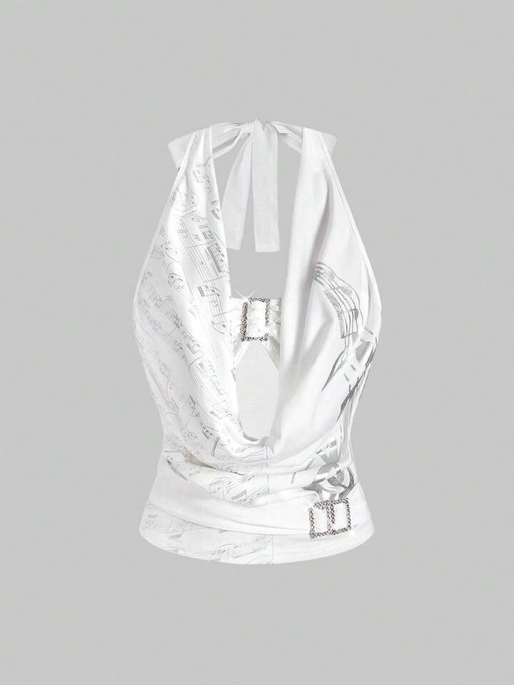 J-Fashion Top de mujer con cuello de escote y cintura fruncida con estampado de notas musicales, estilo Y2K