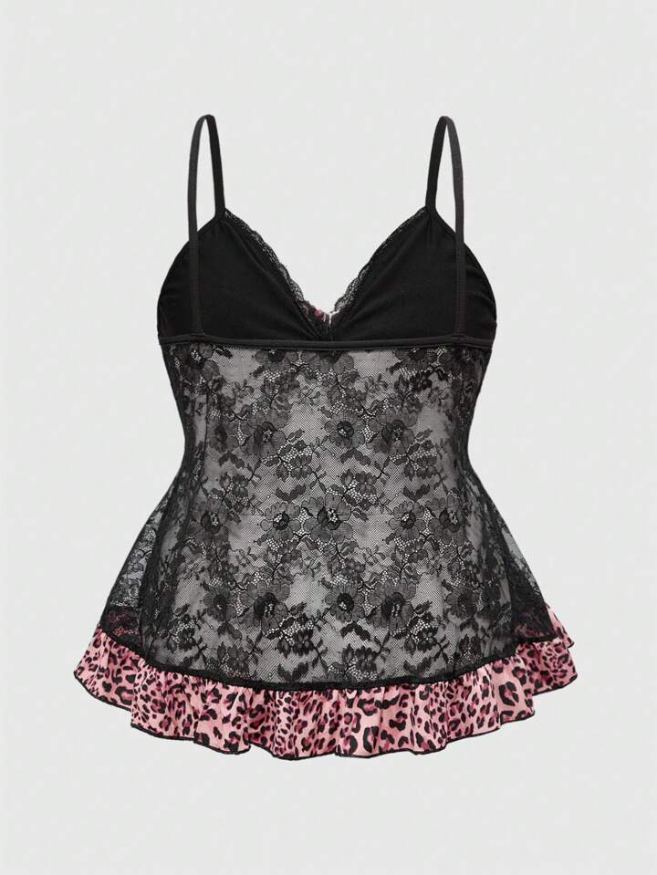 J-Fashion Top tipo camiseta y top sin mangas con parches de encaje y estampado de leopardo en estilo retro Gyaru Shibuya-Gal Himekaji Y2K, talla grande