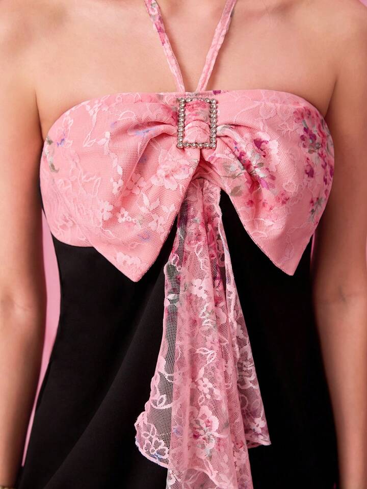 J-Fashion Vestido mini de manga corta ajustado con estampado de mariposas y parches de encaje en estilo Y2K para mujeres