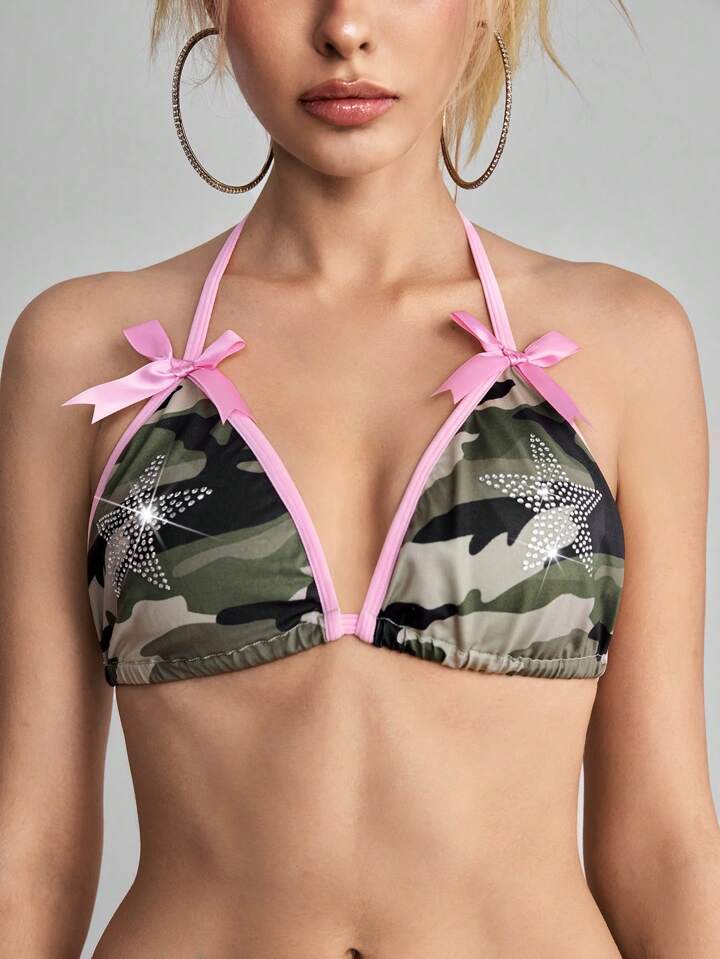 J-Fashion Brasier inalámbrico con decoración de lazo, estrella de strass y camuflaje con estilo Y2K