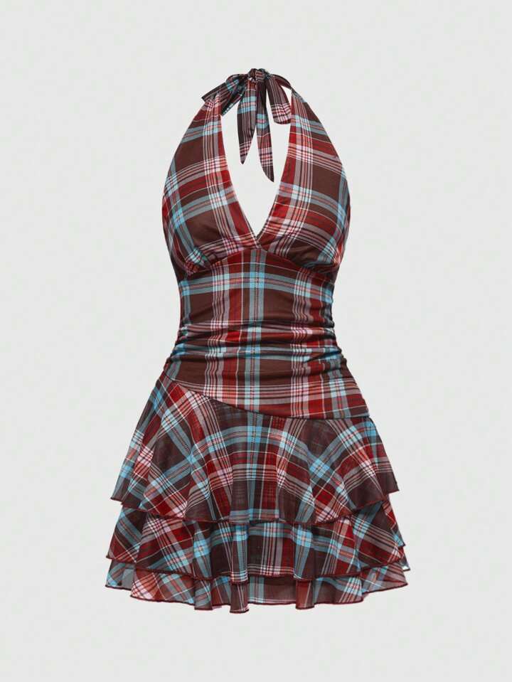 J-Fashion Vestido halter de mujer a cuadros de colores estilo Y2K