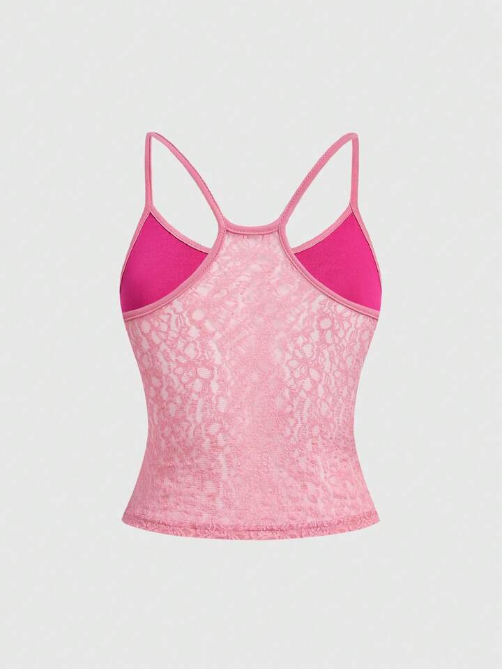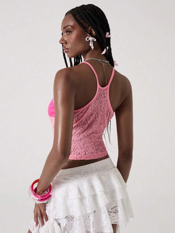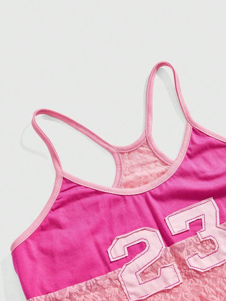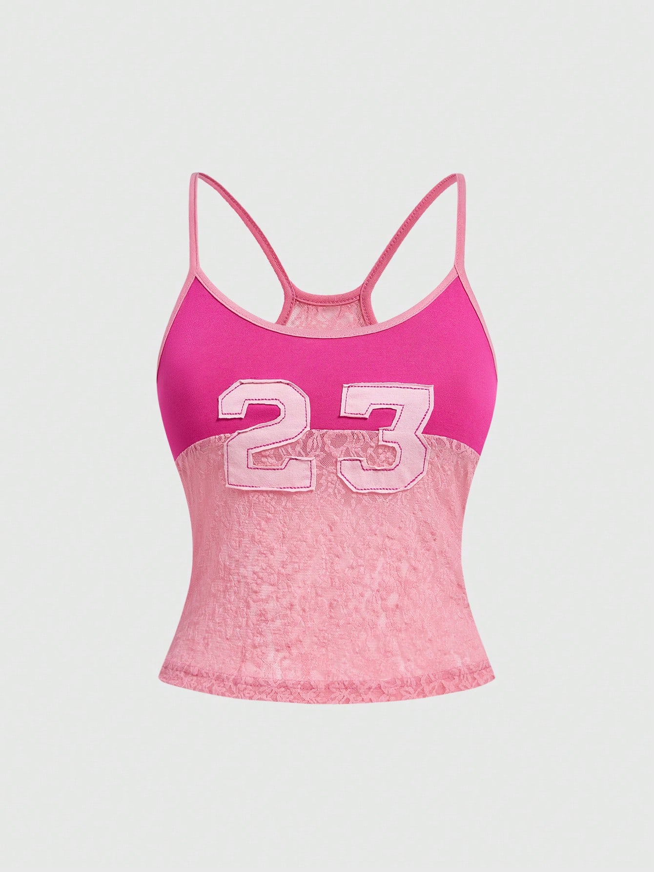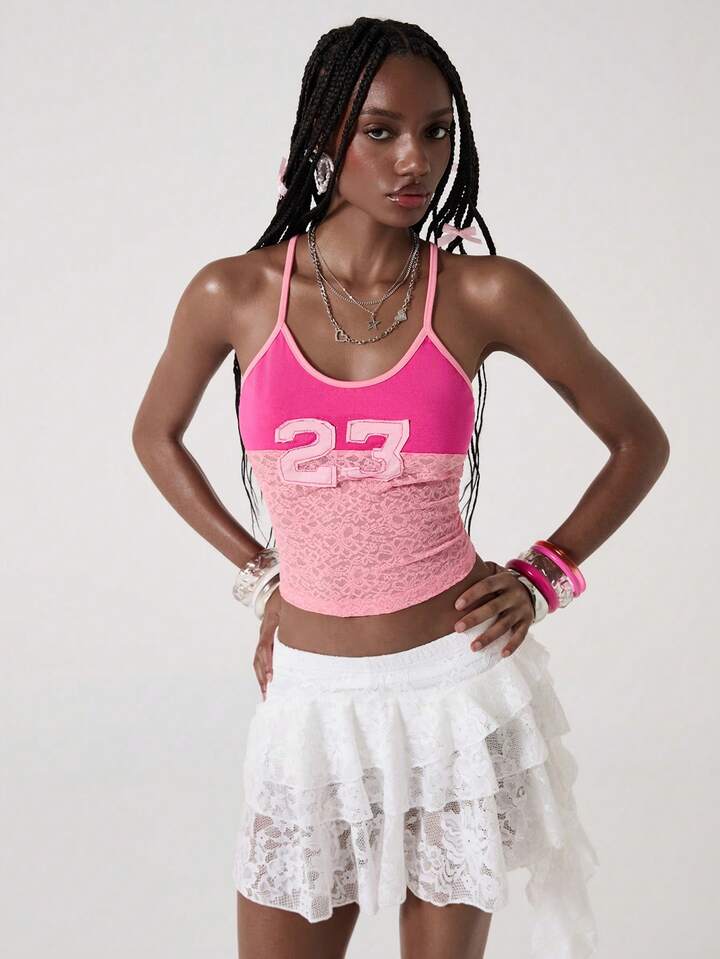 J-Fashion Top de camisola con contraste de encaje, bordado gráfico, estilo Y2K para mujeres