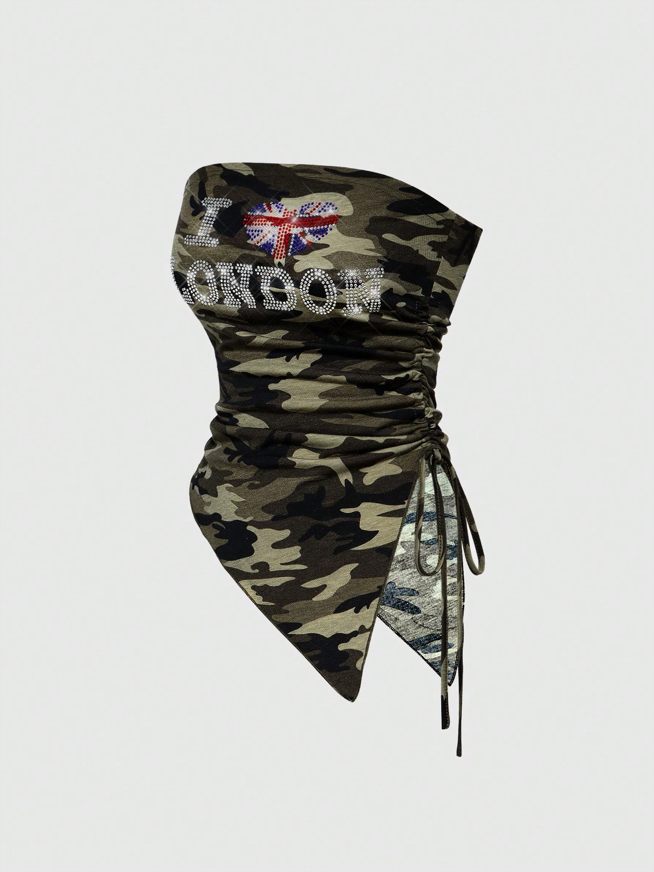 J-Fashion Top ceñida y sexy de estilo Y2K con estampado de camuflaje, asimétrica y con cordón para mujer