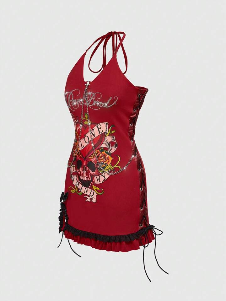 J-Fashion Minivestido con estilo Y2K con diseño de tatuaje de rosa con esqueleto