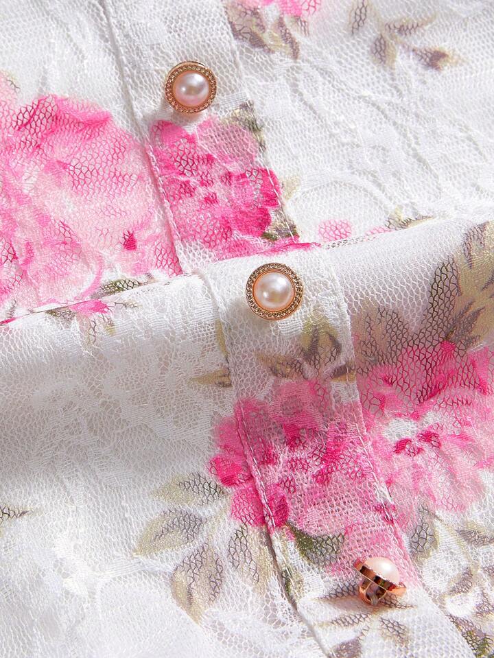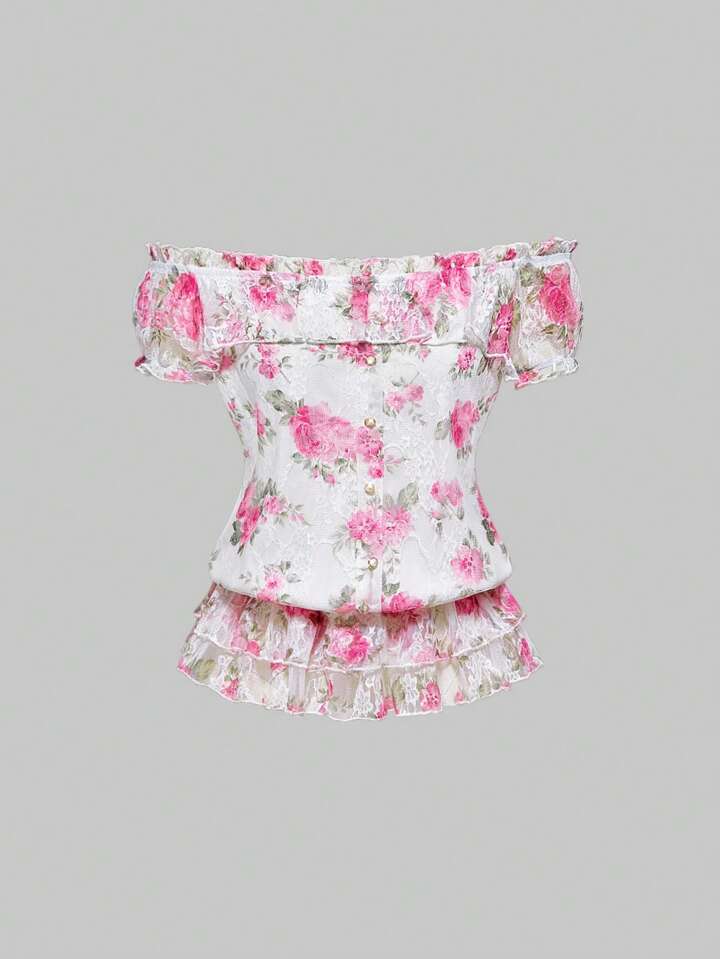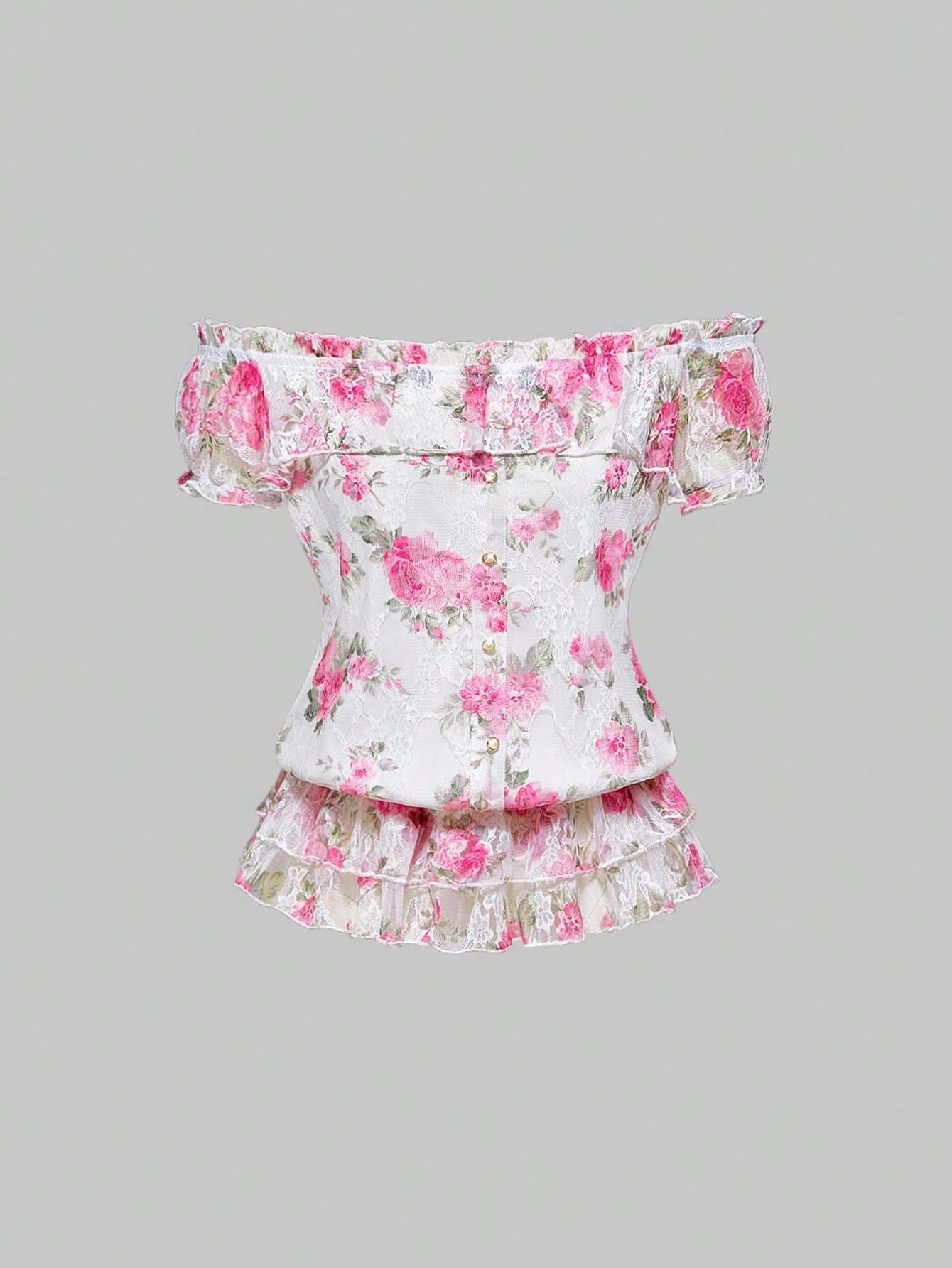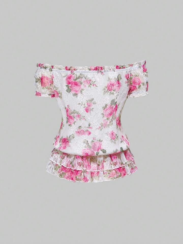 J-Fashion Blusa de mujer con estilo Y2K, con hombros descubiertos, estampado de encaje y bajo abombado