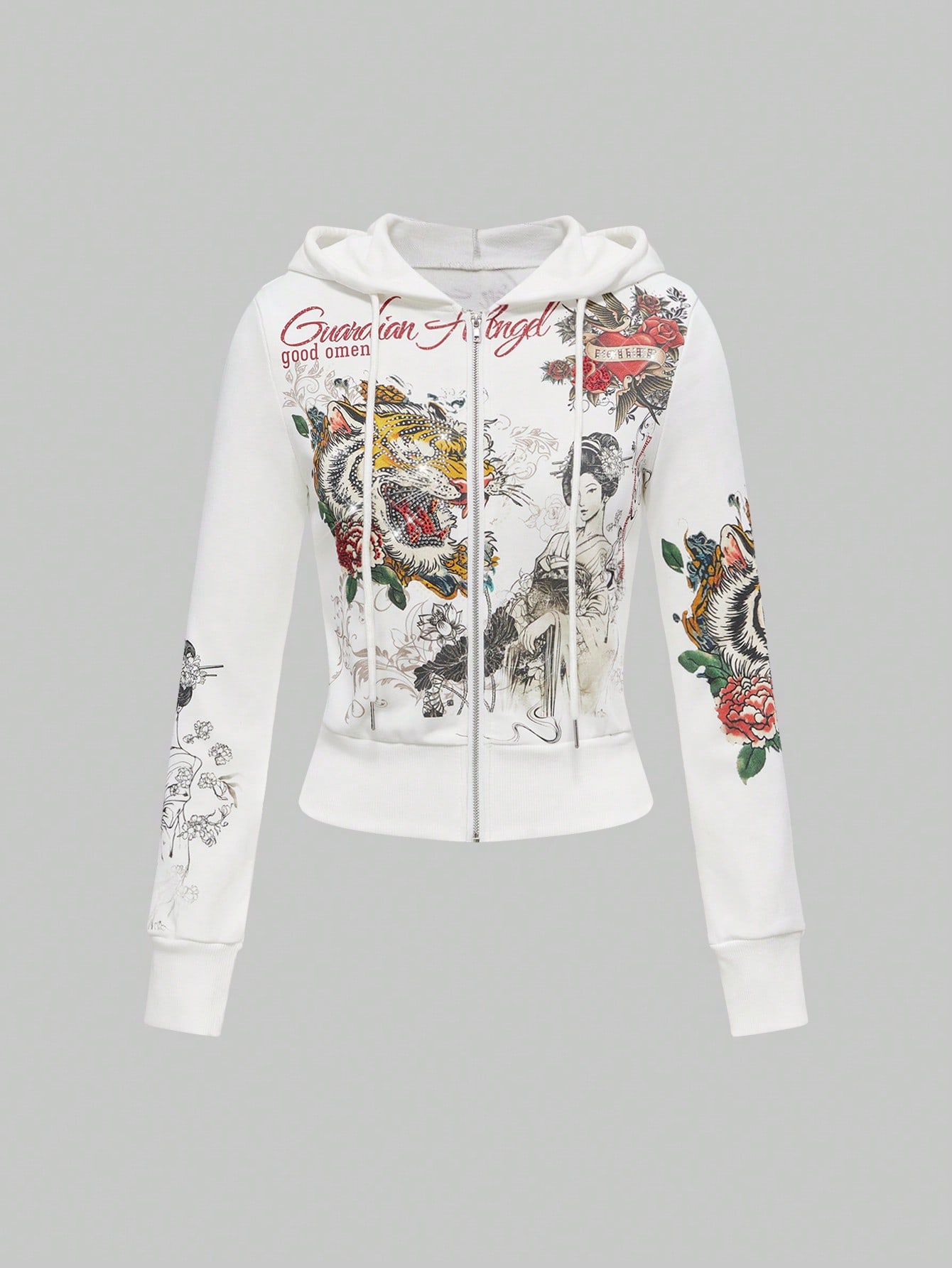J-Fashion Sudadera con capucha ajustada con estampado de geisha, tigre y rosa, estilo neo-chino de la subcultura Y2K para mujeres