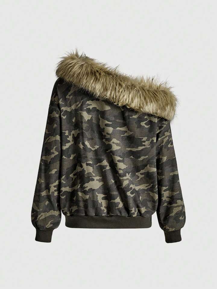 J-Fashion Sudadera asimétrica de hombro para mujer con estampado de camuflaje de cristal y parches de peluche, subcultura Y2K