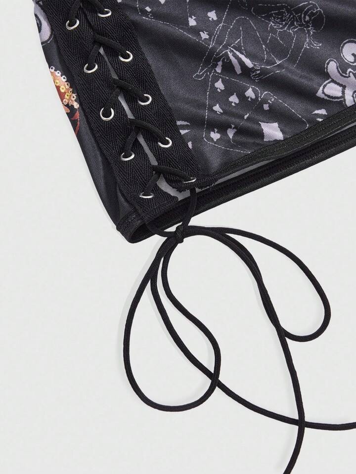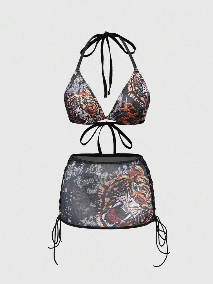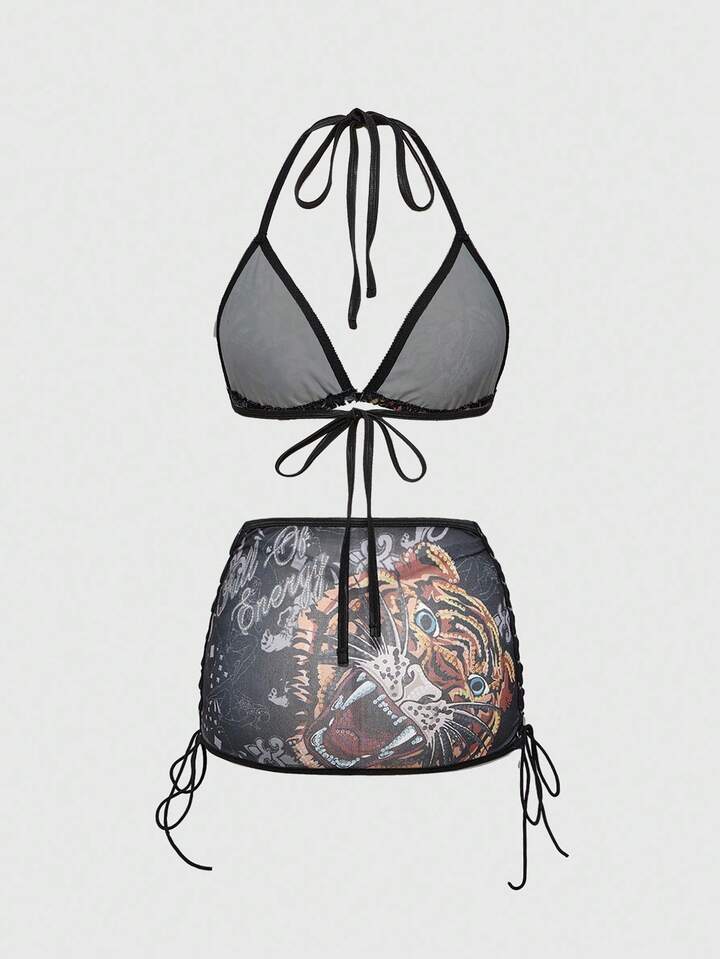 J-Fashion Conjunto de lencería sexy inalámbrica con estampado de tigre y encaje en malla con cordones, estilo Y2K para mujeres