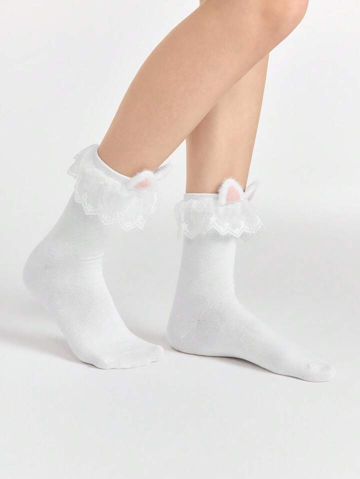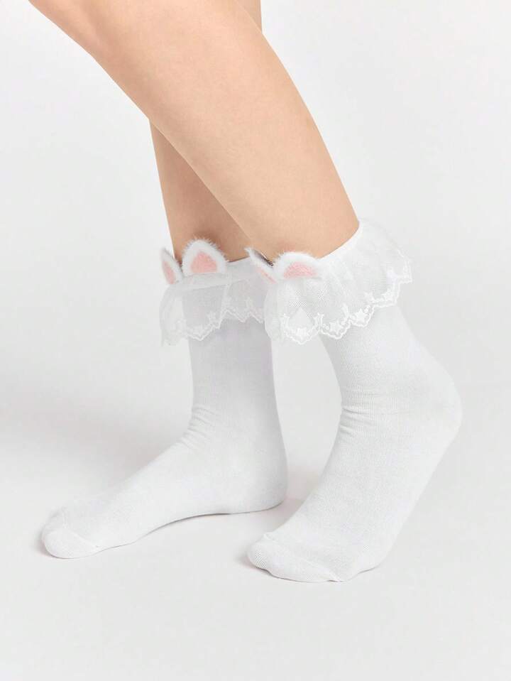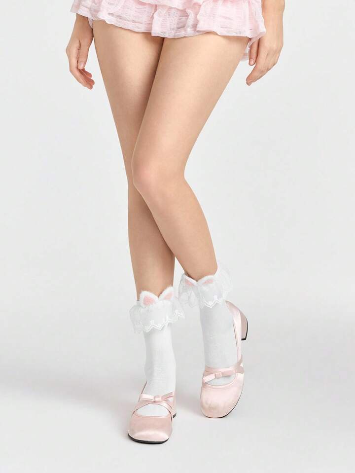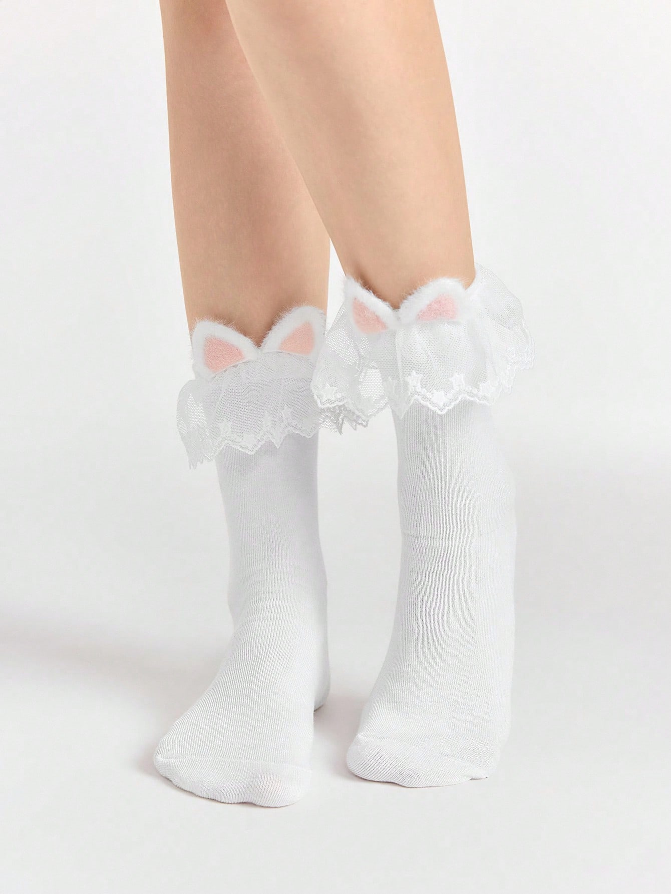 Kawaii 1 par de calcetines hasta media pantorrilla de color rosa suave con orejas de gato, calcetines tobilleros con estampado de estrellas y encaje, calcetines de estilo colegial versátiles para mujer