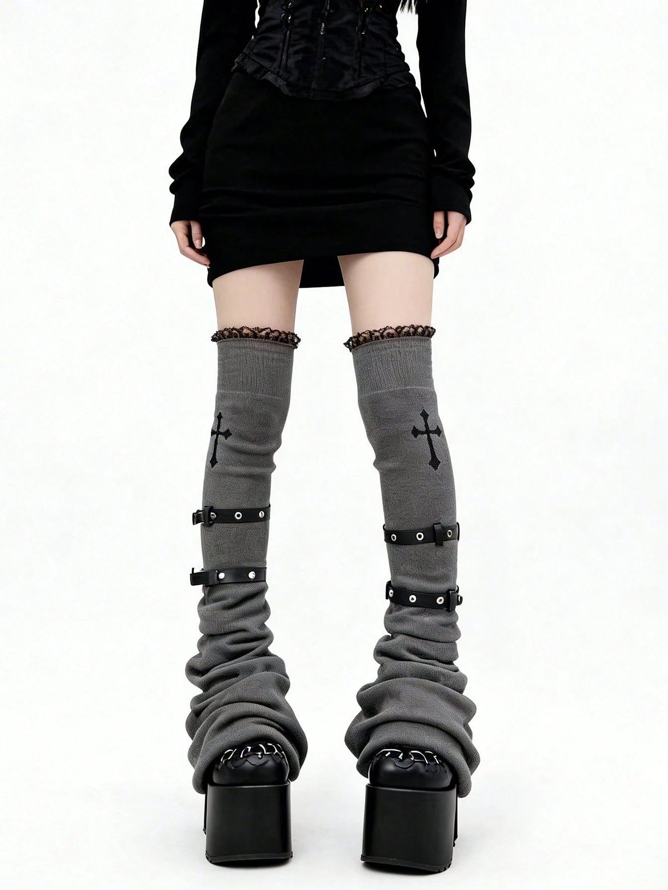 Kawaii Un par de calcetines de rodilla de punto estilo punk, diseño de nicho, bordado de cruz, cubierta de bota de encaje, cubierta de calcetines apilados con correas de primavera y otoño, que no se deshilacha fácilmente