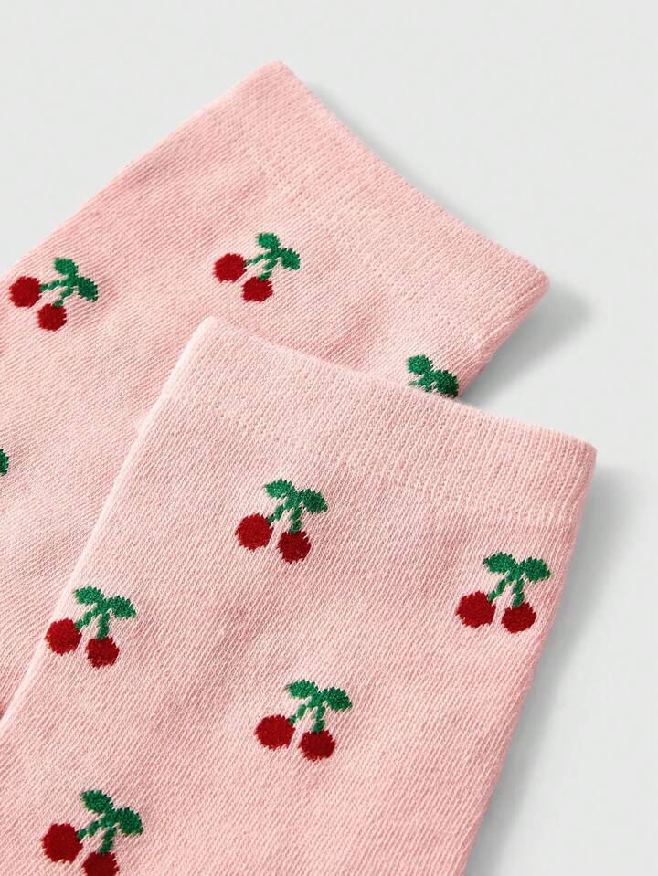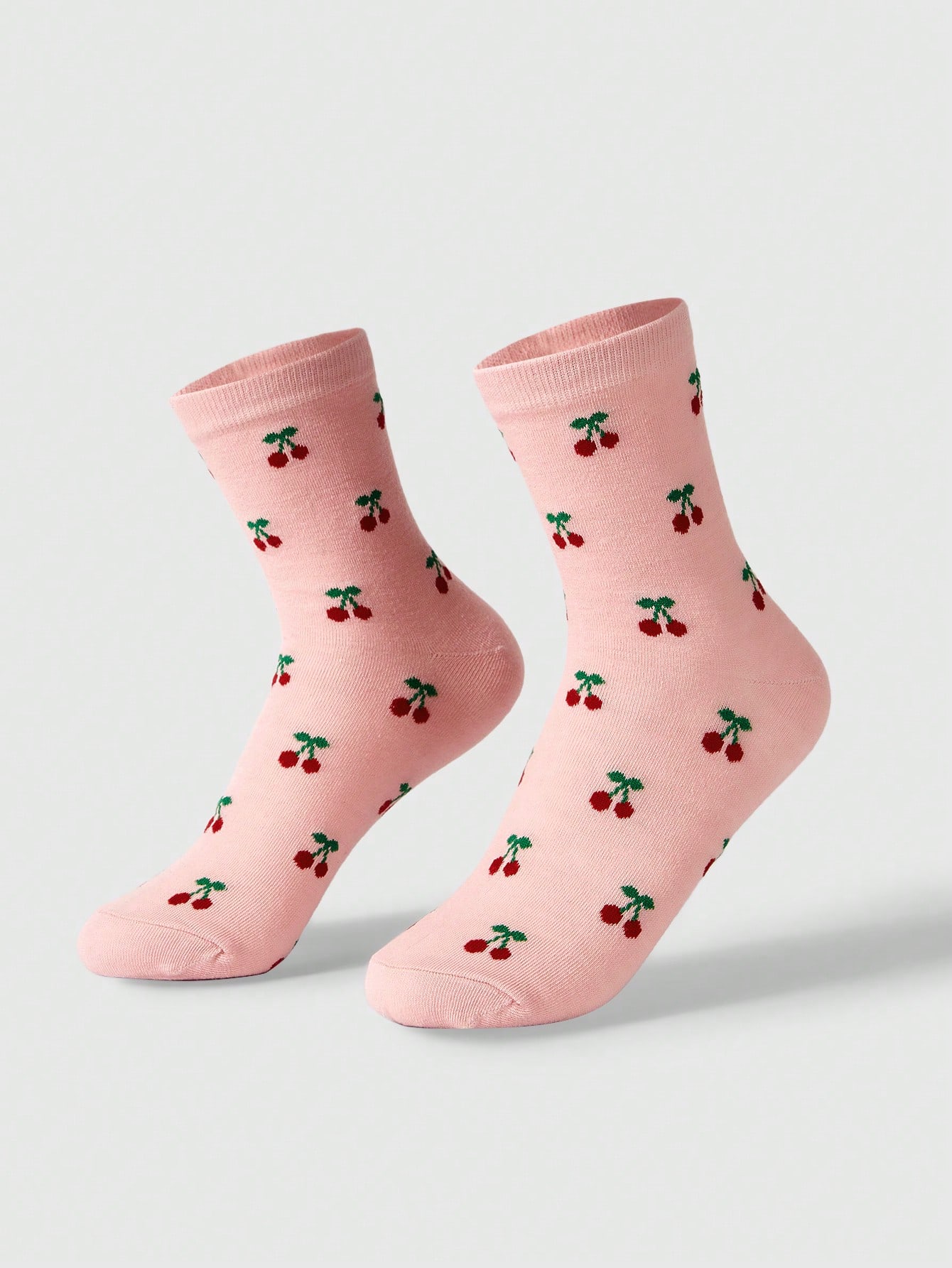 Kawaii 1 par de calcetines hasta la pantorrilla con diseño de cerezas rosadas para mujeres, todo el año