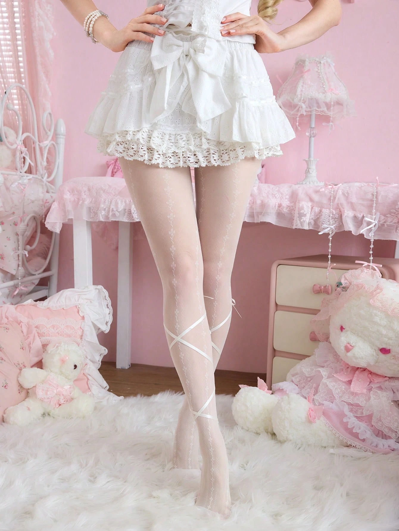 Kawaii 1 par de medias transparentes de estilo bailarina de encaje jacquard para mujer, pantimedias blancas estilo Lolita dulce con lazo (se necesita DIY para el lazo)