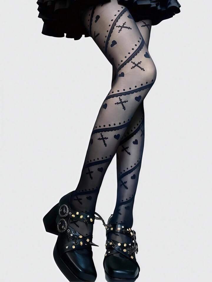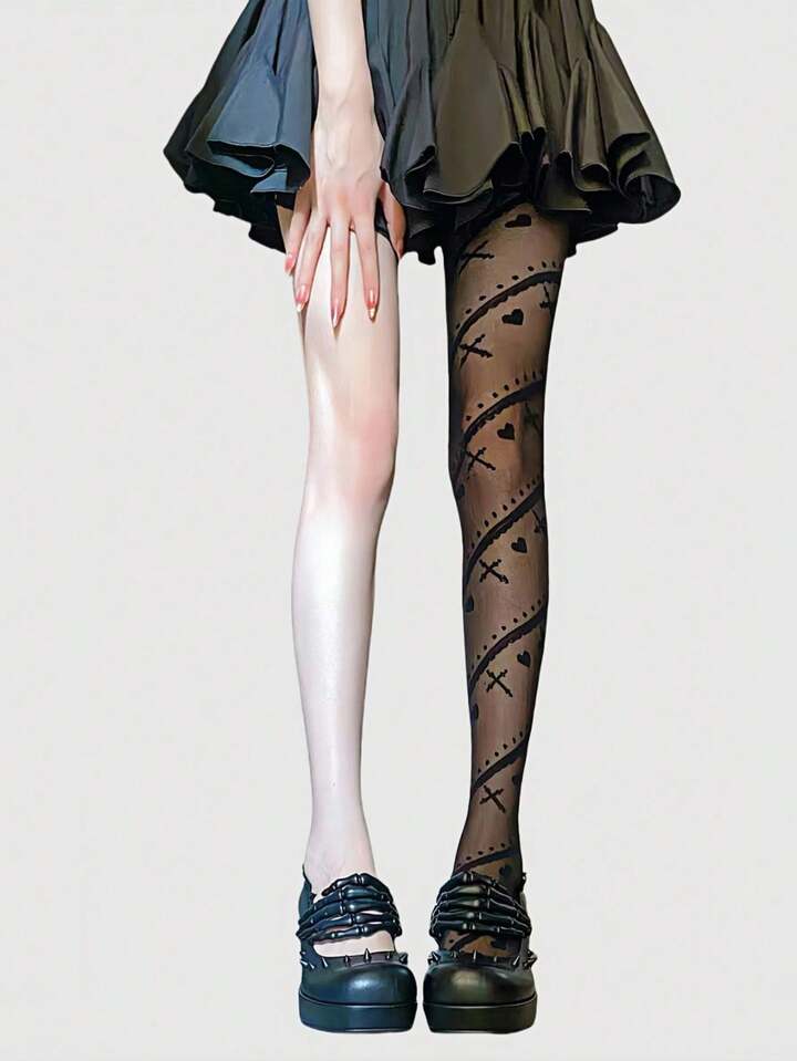 Kawaii 1 par de pantimedia/medias ligeras y transparentes de mujer en color negro con estampados vintage de cruz, lunares, corazones románticos, rayas simples, en estilo punk gótico, adecuado para el estilo lolita, Halloween