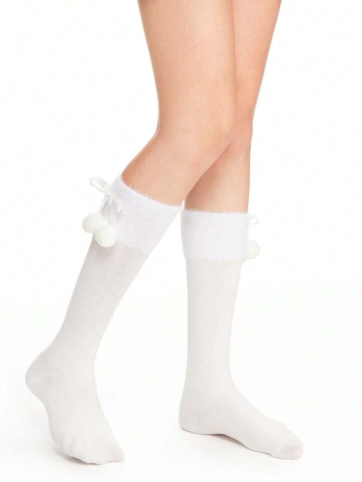 Kawaii 1 par de calcetines cómodos y sencillos de unicolor con pompones hasta el tobillo para mujer