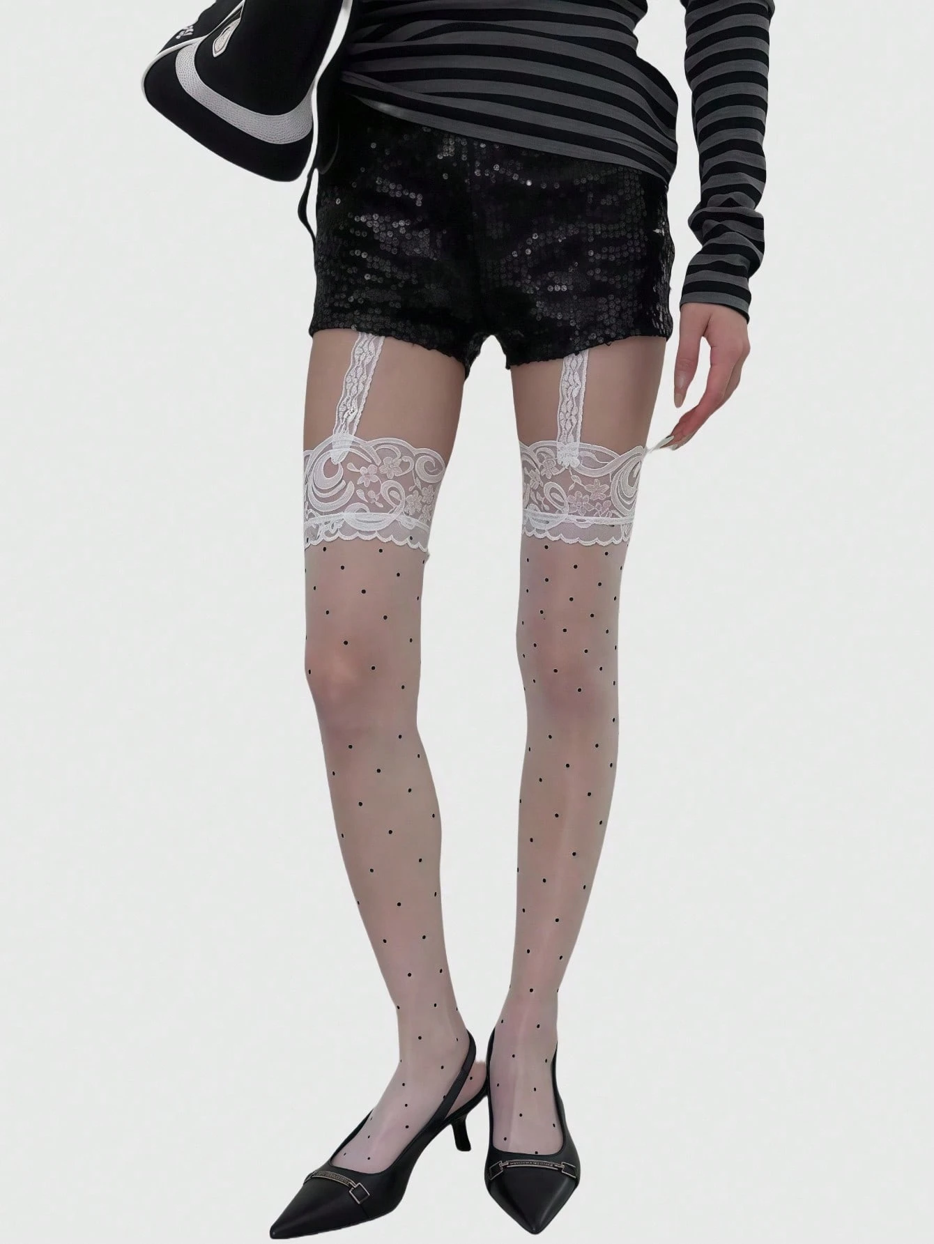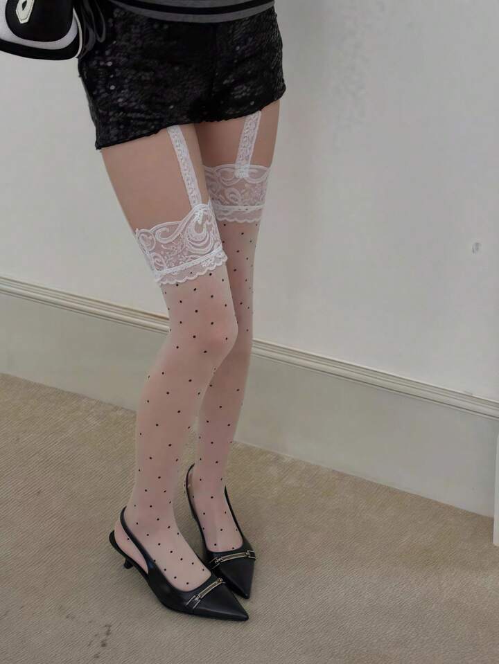 Kawaii 1 par de medias/pantimedias/mallas blancas y sexys para mujer con encaje y diseño de lunares en unicolor, ideales para ir al trabajo, de compras, citas y complementar vestidos